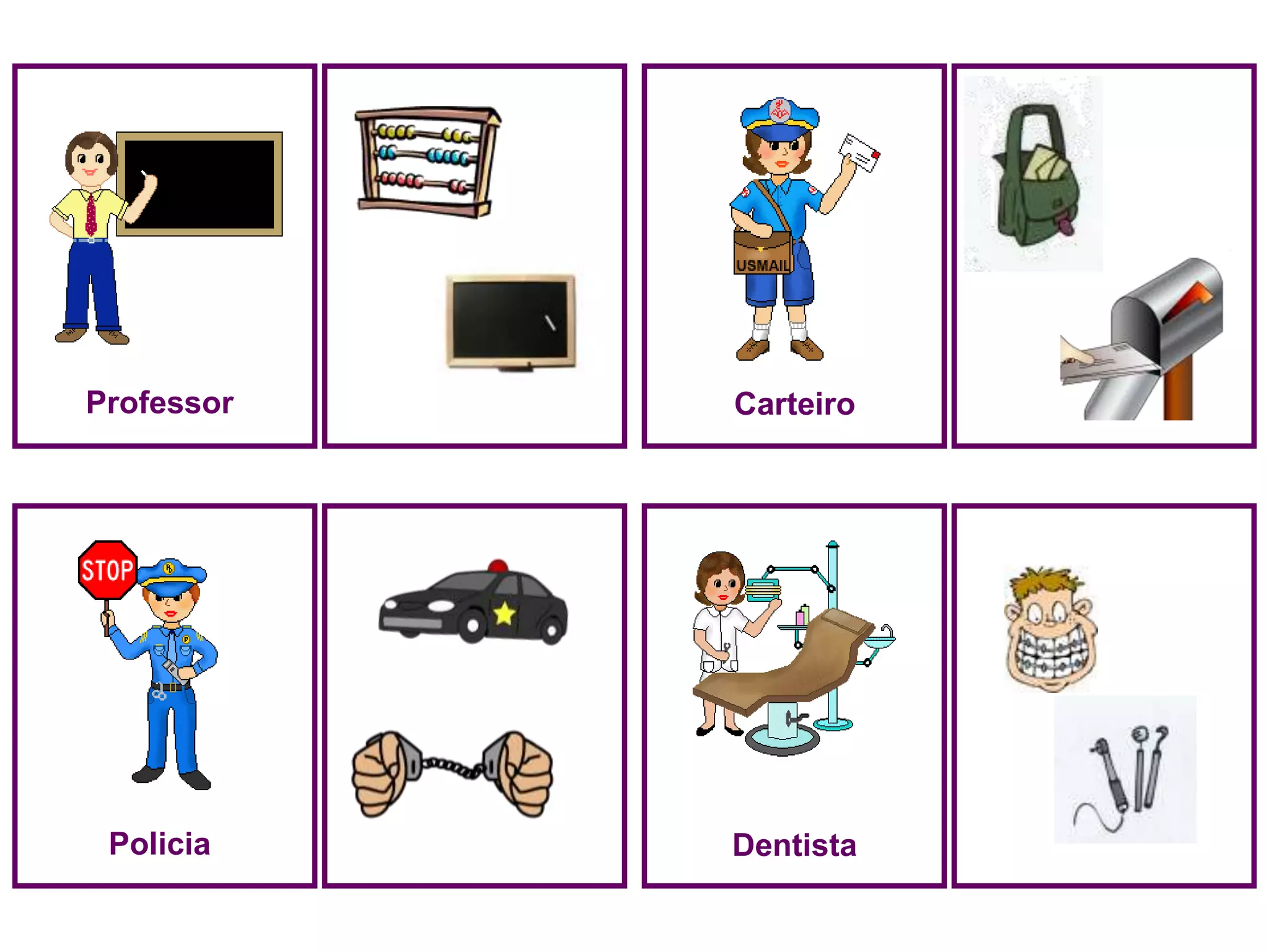 Este documento apresenta vários profissionais e suas ferramentas de trabalho em um jogo de associação, incluindo professores, carteiros, policiais, dentistas, cabeleireiros, bombeiros, mecânicos, cozinheiros, veterinários, enfermeiras, nadadores, padeiros, salvadores, médicos, agricultores, juízes, advogados, limpa-chaminés, motoristas, carpinteiros, aviadores, pescadores e apicultores. O objetivo do jogo é relacionar cada profissão aos seus