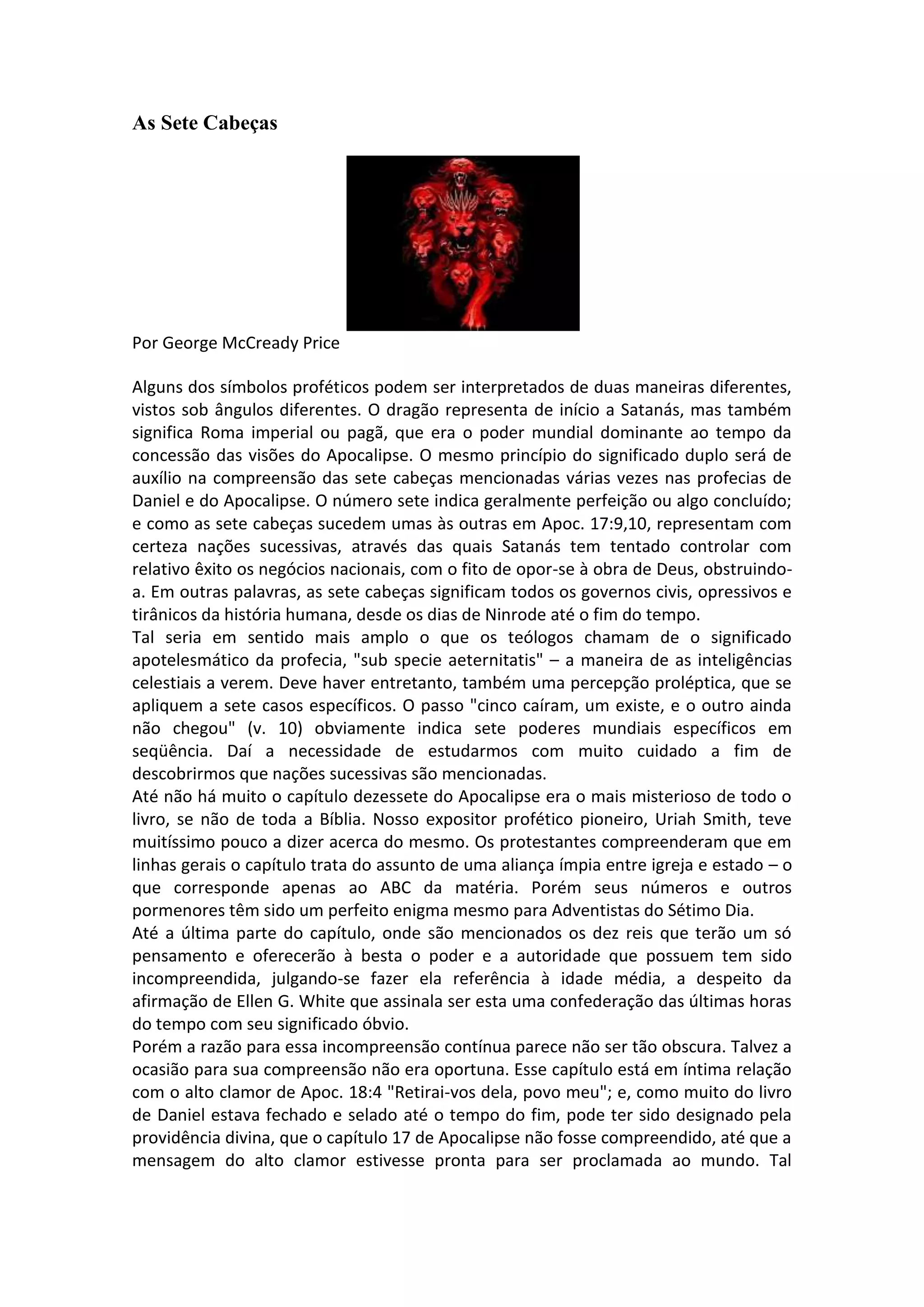 Este documento discute a interpretação das sete cabeças mencionadas no Apocalipse. Argumenta que elas representam sete governos opressivos desde os dias de Ninrode: 1) Babilônia antiga, 2) Império Medo-Persa, 3) Grécia, 4) Roma pagã, 5) Roma papal, 6) o ateísmo da Revolução Francesa, 7) o liberalismo e a apostasia moderna.