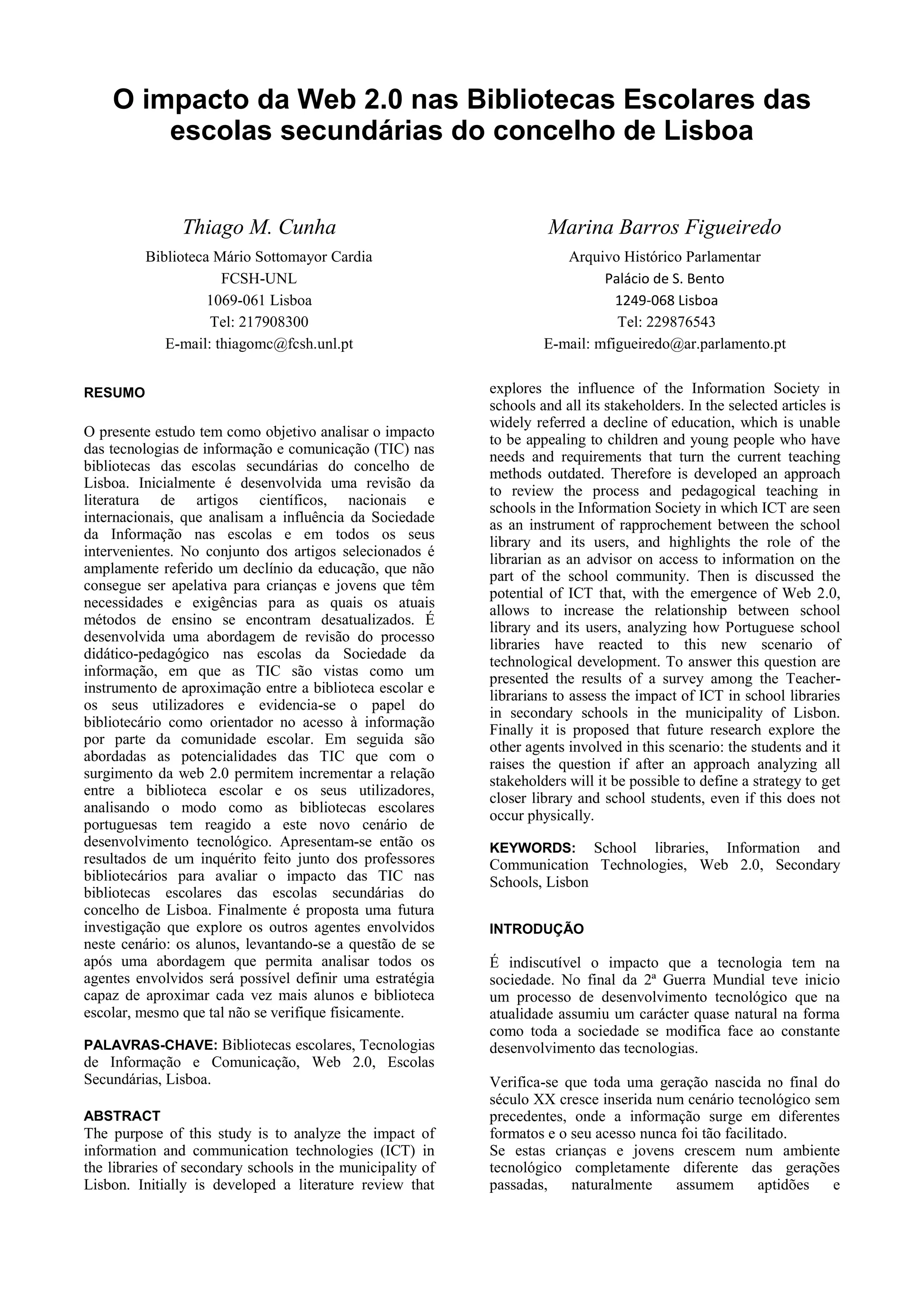 O documento analisa o impacto das tecnologias de informação e comunicação (TIC) nas bibliotecas escolares das escolas secundárias de Lisboa. Inicialmente, faz uma revisão da literatura sobre como as TIC influenciam a educação e o papel das bibliotecas. Depois, apresenta os resultados de um inquérito sobre como as bibliotecas escolares usam as TIC e a Web 2.0. Finalmente, propõe futuras investigações sobre como aproximar bibliotecas e alunos digitalmente.