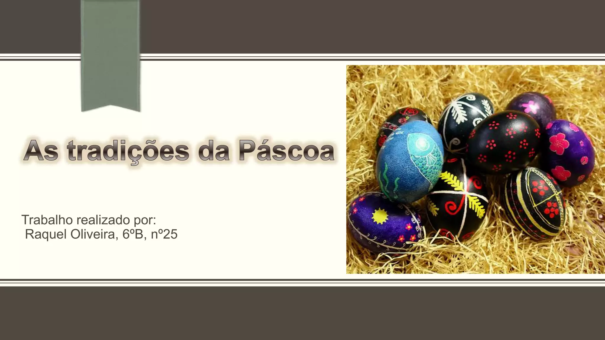 O documento aborda a Páscoa cristã, celebrando a ressurreição de Jesus Cristo três dias após sua morte na cruz. Também descreve tradições portuguesas como o folar da Páscoa e caça aos ovos, e explica que a Sexta-feira Santa lembra o julgamento e crucificação de Cristo, enquanto o Domingo de Páscoa celebra sua ressurreição.
