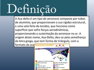 A Asa Delta é uma aeronave composta por tubos de alumínio e uma vela feita de tecidos que fornece sustentação. Sua origem vem da semelhança com a letra grega Delta. Atualmente, as asas deltas evoluíram para um formato aerodinâmico e contam com equipamentos eletrônicos que melhoraram a segurança do esporte e aumentaram sua popularidade no Brasil.