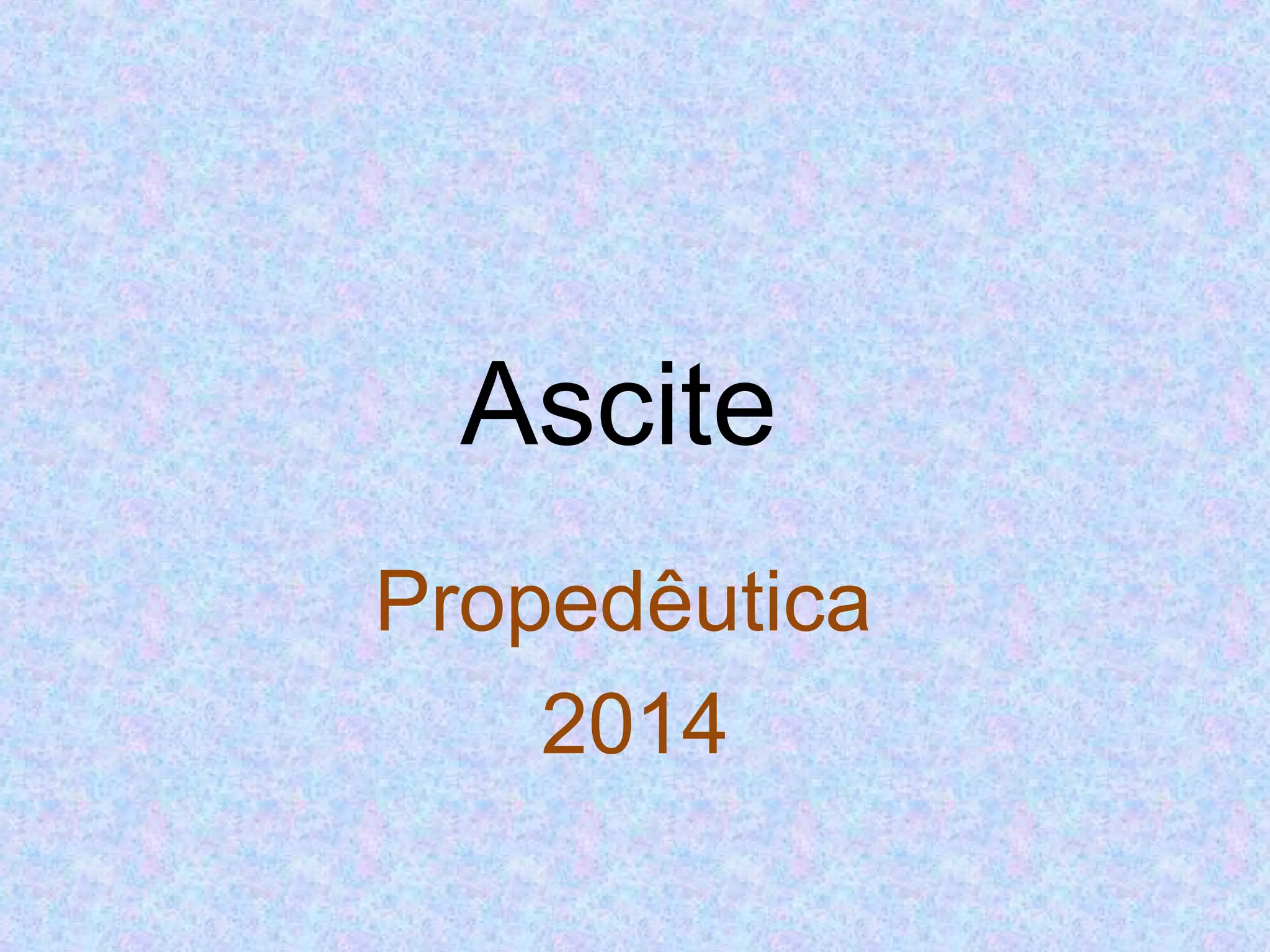 A ascite possui várias etiologias. O diagnóstico é feito através de exame físico, ultrassom e paracentese, que fornece amostras de líquido para análise de cultura, citologia e gradiente de albumina sérica-ascítica. A paracentese é importante para alívio de sintomas e diagnóstico da causa.