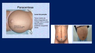 O documento descreve a ascite, definindo-a como o acúmulo de líquido na cavidade peritoneal. Mais de 90% das causas são devidas a cirrose, carcinomatose peritoneal, insuficiência cardíaca e tuberculose peritoneal. A fisiopatogenia inclui hipertensão portal, hipoalbuminemia e retenção de sódio e água pelos rins. O exame físico busca sinais de hepatopatia crônica e aumento de volume abdominal.