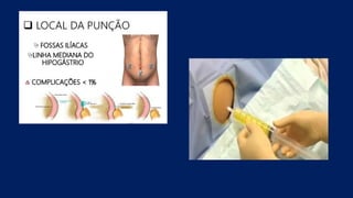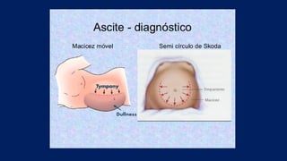 O documento descreve a ascite, definindo-a como o acúmulo de líquido na cavidade peritoneal. Mais de 90% das causas são devidas a cirrose, carcinomatose peritoneal, insuficiência cardíaca e tuberculose peritoneal. A fisiopatogenia inclui hipertensão portal, hipoalbuminemia e retenção de sódio e água pelos rins. O exame físico busca sinais de hepatopatia crônica e aumento de volume abdominal.