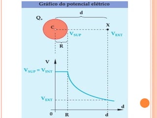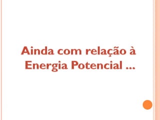 O documento discute conceitos fundamentais de energia potencial gravitacional e elétrica, incluindo: 1) objetos se movem espontaneamente de regiões de maior para menor potencial gravitacional/elétrico; 2) o trabalho da força elétrica depende da carga transportada; 3) o potencial elétrico mede a capacidade de realizar trabalho e é afetado pela distribuição de cargas no espaço.