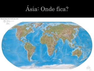 O documento descreve as diversas regiões da Ásia, destacando suas características culturais, paisagísticas e climáticas. A Ásia é marcada por grandes civilizações e contrastes, com regiões como a Sibéria de clima polar, o Sudeste Asiático equatorial e florestado, e o Oriente Médio árido e desértico, dominado pelo Islã. As diversas regiões apresentam distintas influências culturais, como a chinesa, hindu e eslava.