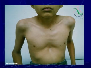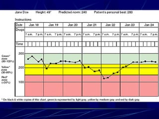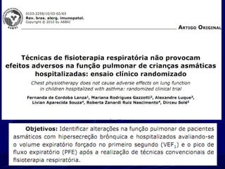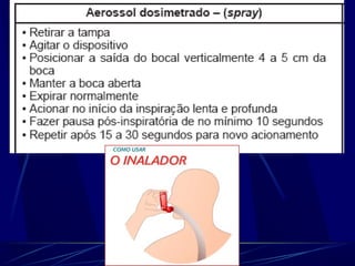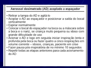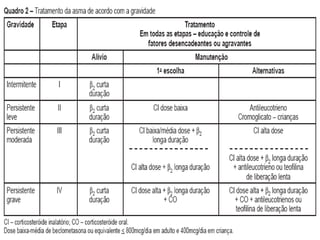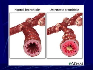 O documento fornece informações sobre asma e rinite alérgica, incluindo suas definições, epidemiologia, patologia, inflamação, diagnóstico e tratamento. Resume os principais pontos sobre asma como uma doença inflamatória crônica das vias aéreas que causa episódios recorrentes de sintomas, e sobre a associação frequente entre asma e rinite alérgica.