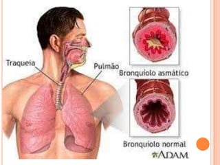 A asma é causada por reações alérgicas que provocam espasmo nos brônquios, dificultando a passagem de ar para dentro e para fora dos pulmões. Os sintomas mais comuns incluem falta de ar, tosse seca, chiado no peito e agravamento durante resfriados. O diagnóstico envolve exames como espirometria e medição de fluxo respiratório, e o tratamento consiste em medicamentos de controle e alívio, como corticosteroides inalados e broncodilatadores.