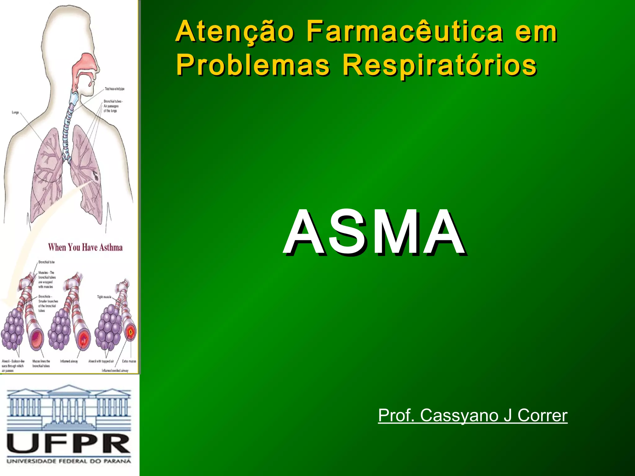 O documento discute asma, uma doença respiratória crônica. Apresenta dados sobre a epidemiologia, diagnóstico e tratamento da asma, incluindo que é uma das doenças crônicas mais comuns, causa absenteísmo e gastos de saúde, e que o diagnóstico envolve avaliações clínicas, funcionais e da alergia.