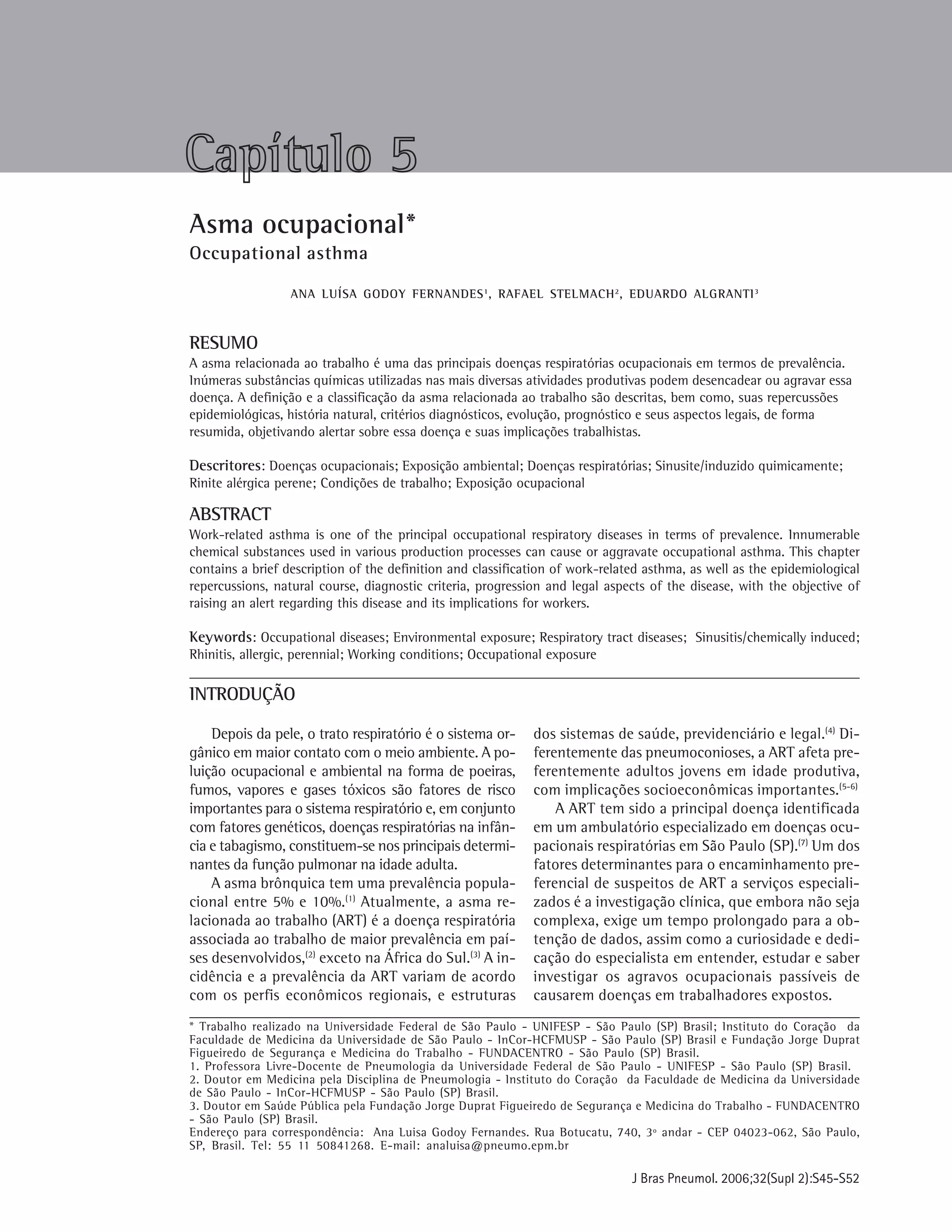 O documento discute a asma ocupacional, definindo-a como obstrução reversível ao fluxo aéreo causada por exposição ocupacional. A asma ocupacional é uma das principais doenças respiratórias ocupacionais em termos de prevalência, afetando entre 5-10% dos adultos com asma. Vários agentes químicos utilizados em diversas indústrias podem desencadear ou agravar a asma ocupacional. O documento descreve os mecanismos, incidência, importância, classificação e história
