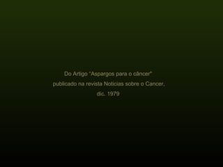 O documento discute como os aspargos podem ser usados para tratar e prevenir o câncer. Relata quatro casos de pacientes com câncer que se curaram após consumirem aspargos cozidos regularmente. O autor, um bioquímico, acredita que os aspargos contêm substâncias que ativam o controle do crescimento celular e podem normalizar o crescimento anormal de células cancerígenas. Ele e sua esposa consomem aspargos diariamente e seus exames de sangue mostraram melhorias.