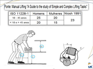 O documento fornece um resumo sobre ergonomia no ambiente de trabalho, abordando três pontos principais: 1) os riscos ergonômicos relacionados a levantamento de cargas, mobiliário e condições ambientais de acordo com a NR-17; 2) a importância da adaptação dos postos de trabalho às características humanas para promover saúde, segurança e eficiência; 3) as quatro contribuições da ergonomia para melhoria das condições de trabalho.