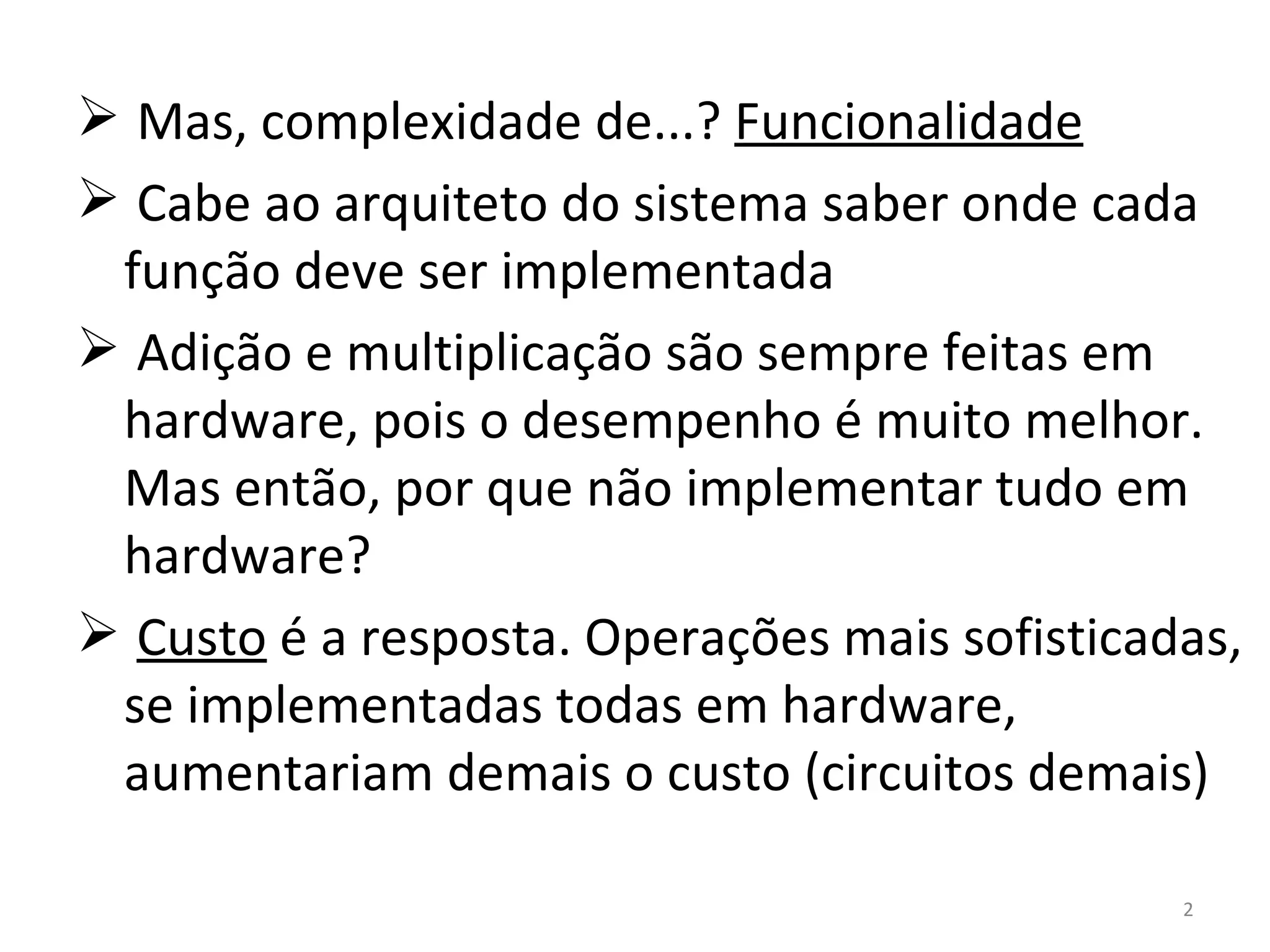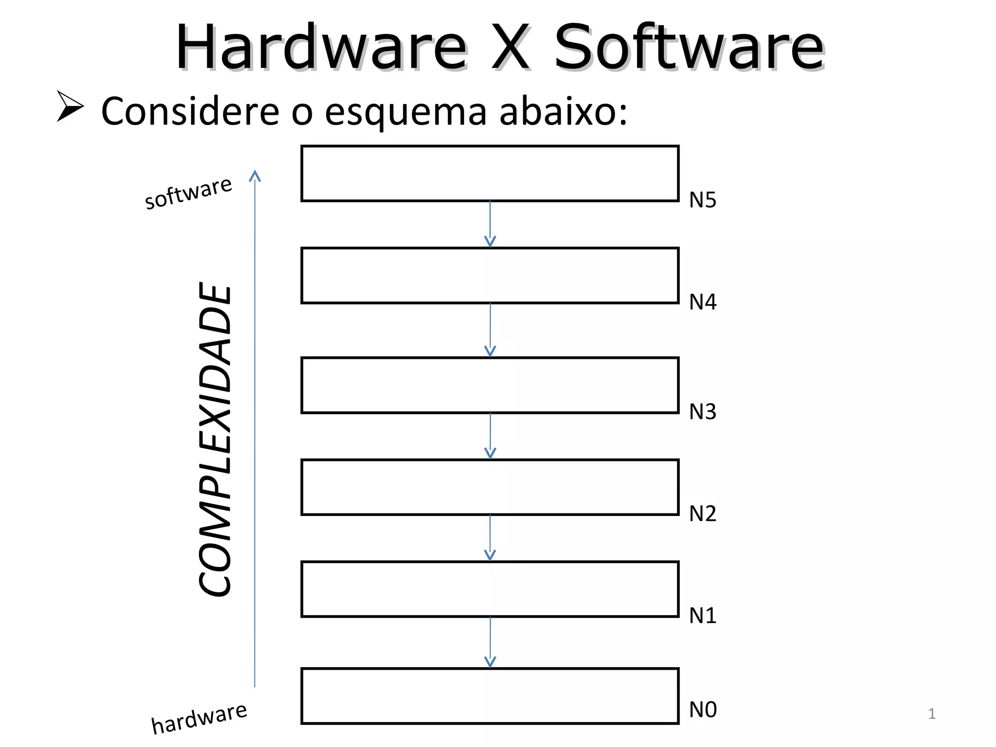 1) O documento discute a complexidade entre hardware e software e como cada um tem suas vantagens e desvantagens.