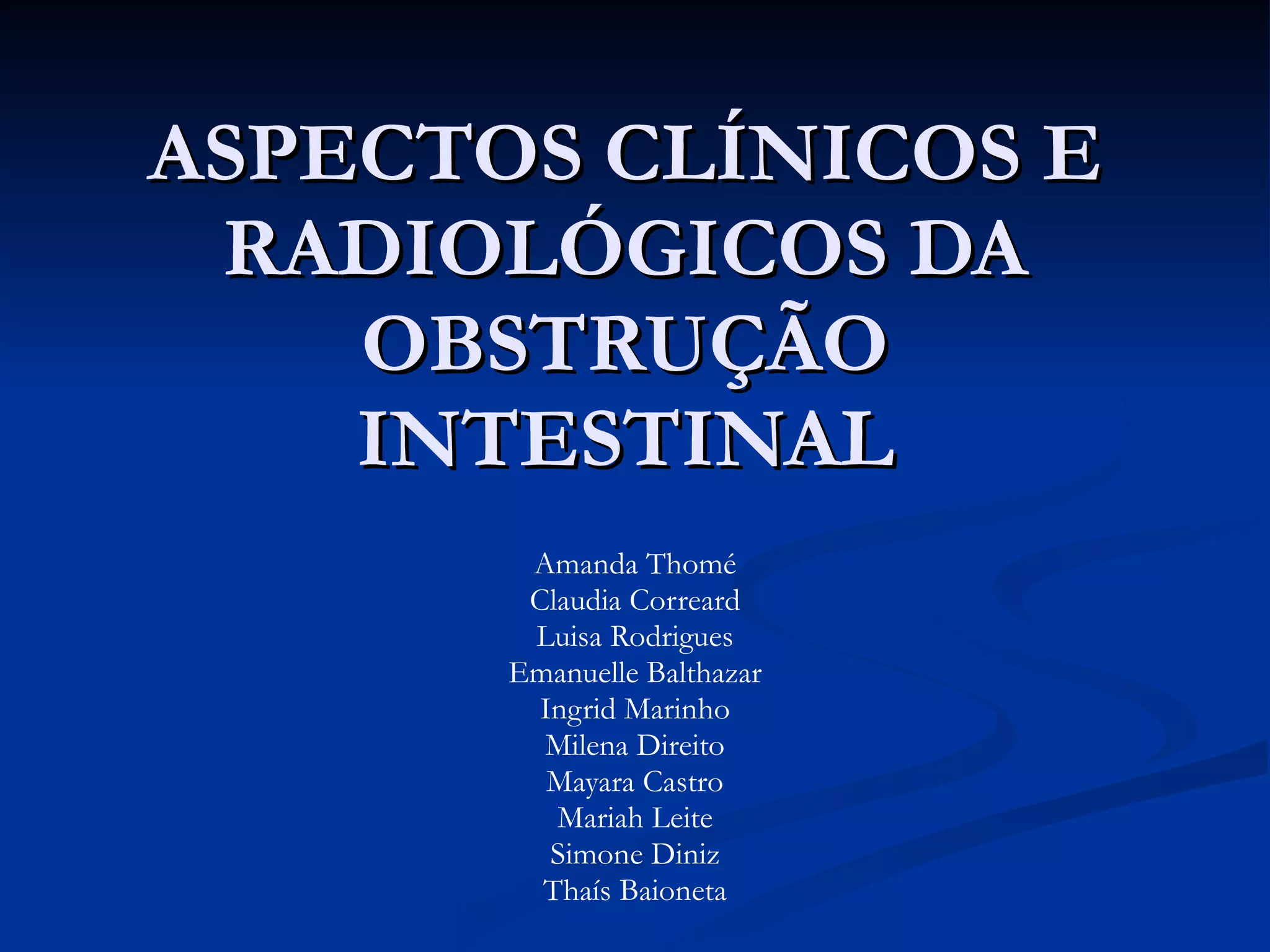 1) A obstrução intestinal ocorre quando há bloqueio parcial ou completo da passagem do bolo fecal pelo intestino.