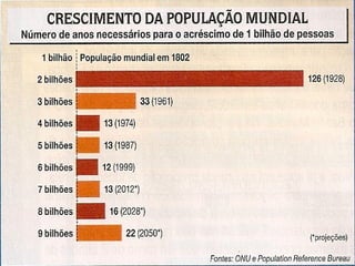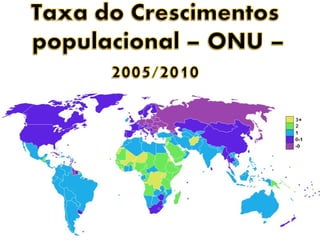 O documento discute as principais teorias demográficas sobre crescimento populacional: a Teoria Malthusiana prevê que a população crescerá mais rápido que a produção de alimentos levando à fome; a Teoria Neomalthusiana atribui a pobreza ao alto crescimento populacional; a Teoria Reformista argumenta que a pobreza causa o alto crescimento e não o contrário. O texto também descreve conceitos como natalidade, mortalidade, expectativa de vida e suas influências no crescimento da população.
