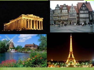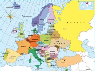 O documento fornece informações gerais sobre o continente europeu. A Europa tem uma área de aproximadamente 10,5 milhões de quilômetros quadrados, população de cerca de 739 milhões de pessoas, e os países mais populosos são Alemanha, França, Itália e Reino Unido. A Europa ocidental desempenhou um papel fundamental no cenário mundial desde o século 15.