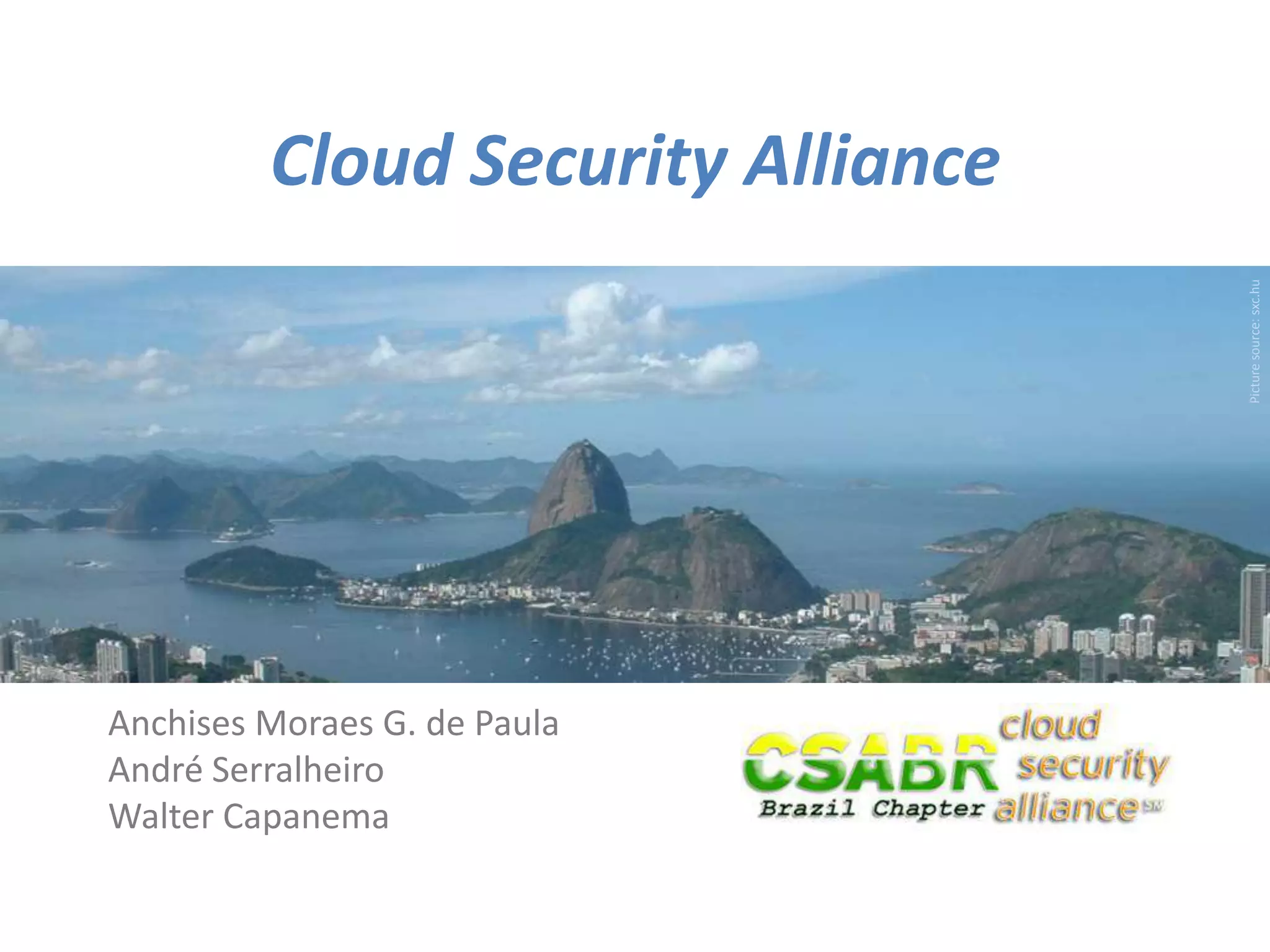 O documento discute a Cloud Security Alliance (CSA) e aspectos relacionados à segurança na nuvem. A CSA é uma associação sem fins lucrativos que promove as melhores práticas de segurança na nuvem através de educação, pesquisa e iniciativas locais. O documento também aborda aspectos jurídicos como contratos e responsabilidade civil na nuvem, bem como tendências como BYOD, Security as a Service e padronização global.
