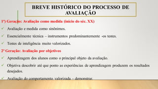 O documento discute a evolução histórica da avaliação educacional em 4 gerações, desde a avaliação como medida até a avaliação como negociação e construção. Também aborda objetivos, tipos, dimensões e instrumentos de avaliação, além de leis e sistemas de avaliação como o Sinaes.