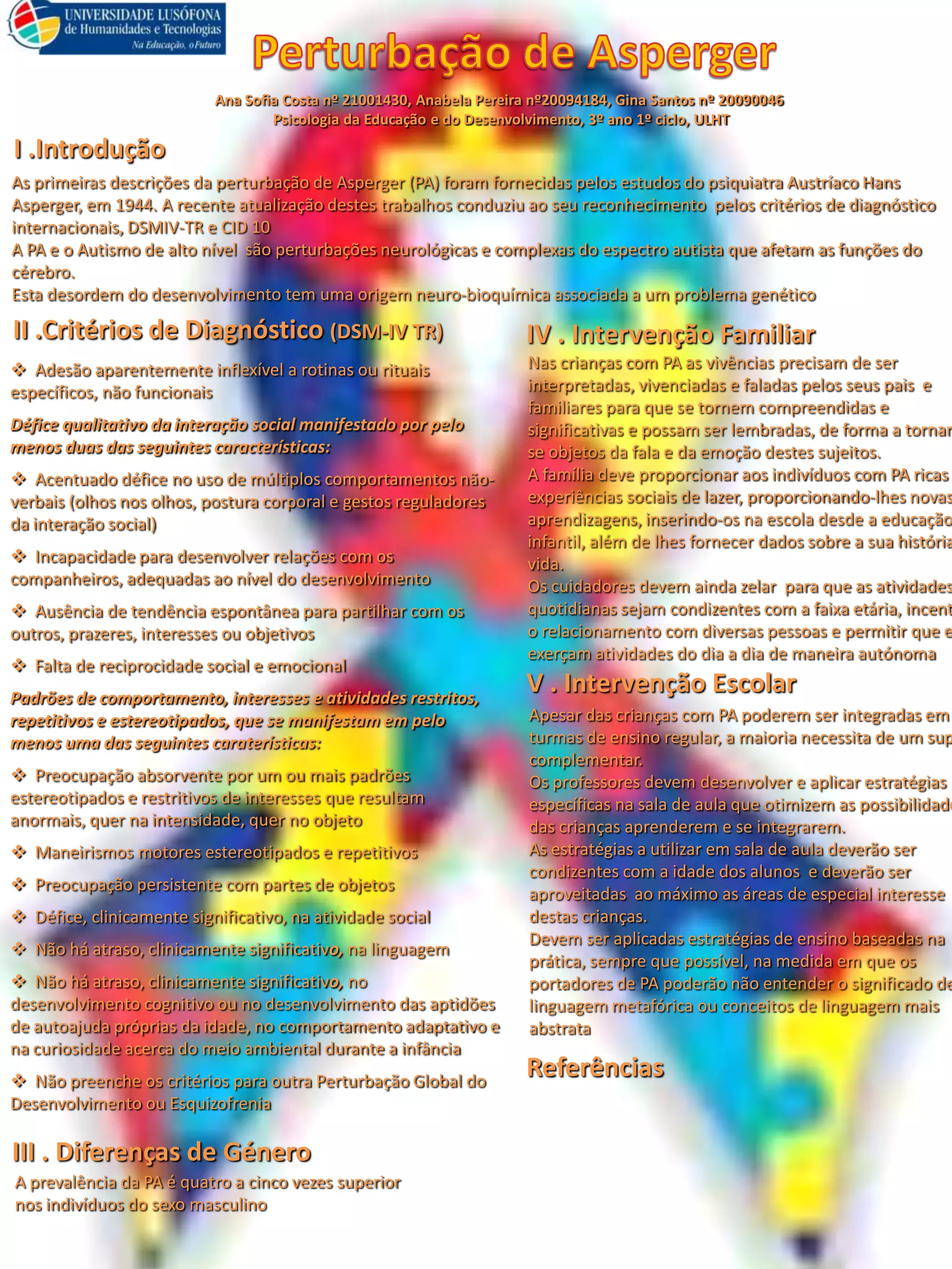 Este documento discute a perturbação de Asperger (PA), incluindo seus critérios de diagnóstico, diferenças de gênero e intervenções familiares e escolares. A PA é uma desordem do espectro autista com origem neurobiológica que afeta principalmente meninos e causa déficits nas interações sociais e comportamentos repetitivos. A família e a escola devem fornecer apoio social e estratégias de ensino adaptadas para ajudar crianças com PA.