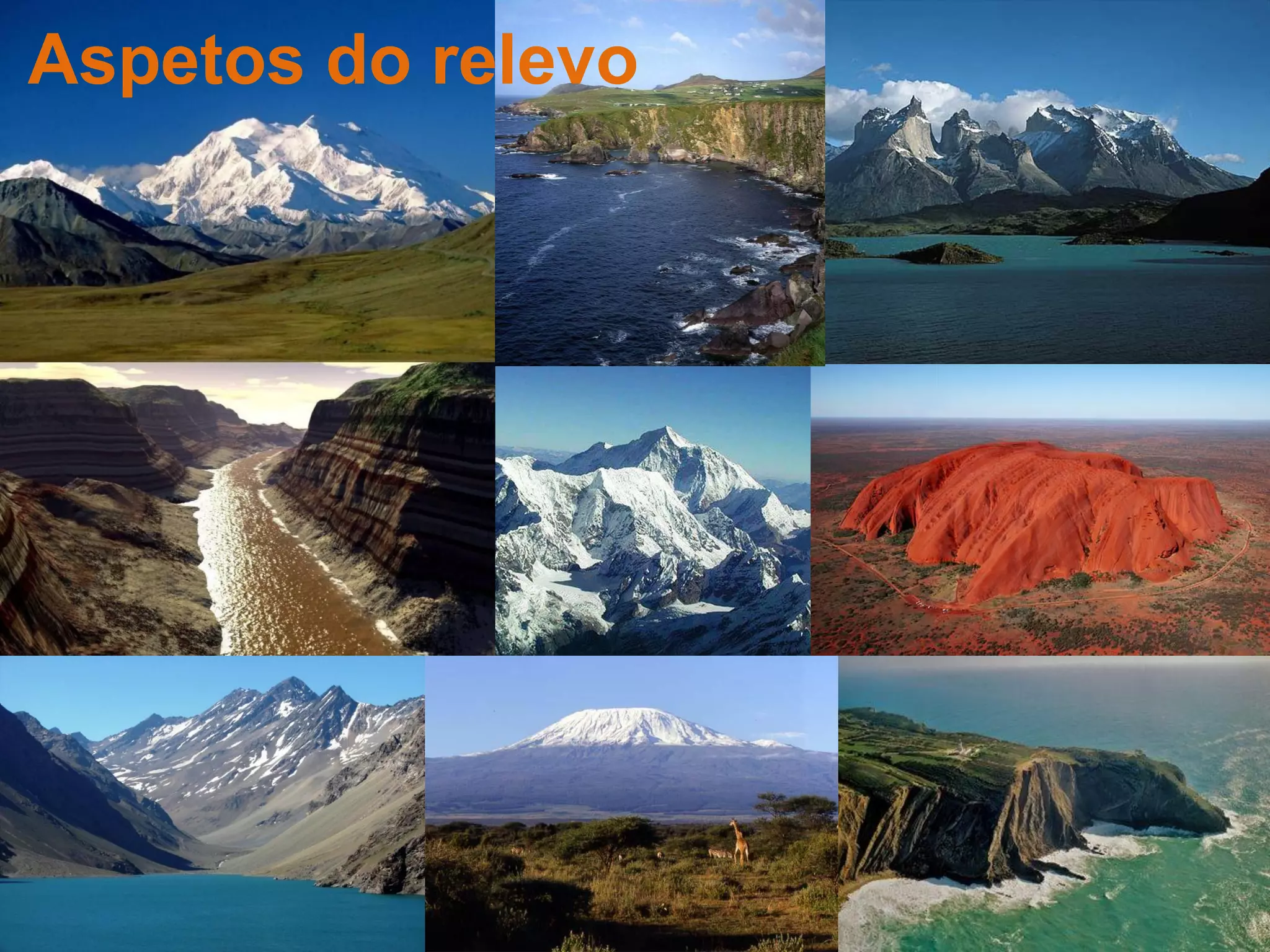 O documento descreve diferentes aspectos do relevo terrestre e hidrográficos de Portugal, incluindo montanhas, planaltos, vales, rios e costa. Detalha as principais serras e rios de Portugal, com o Tejo, Douro e Guadiana sendo os maiores rios do país. O documento fornece informações sobre características geográficas como arribas, praias, cabos, golfos e fiordes.