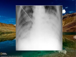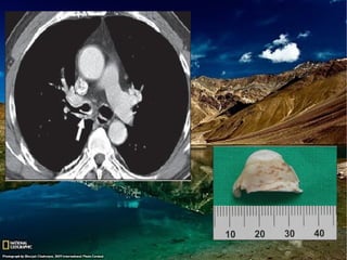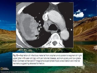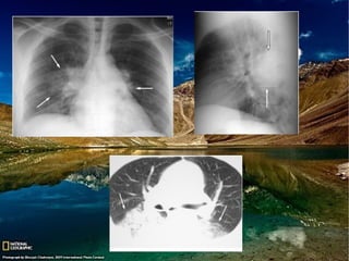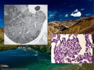 O documento discute vários tipos de aspiração pulmonar, incluindo pneumonite aspirativa, pneumonia aspirativa, aspiração de líquidos ou partículas, e aspiração de corpos estranhos. Fornece detalhes sobre os achados clínicos, histológicos e de imagem de cada condição, assim como o diagnóstico diferencial.