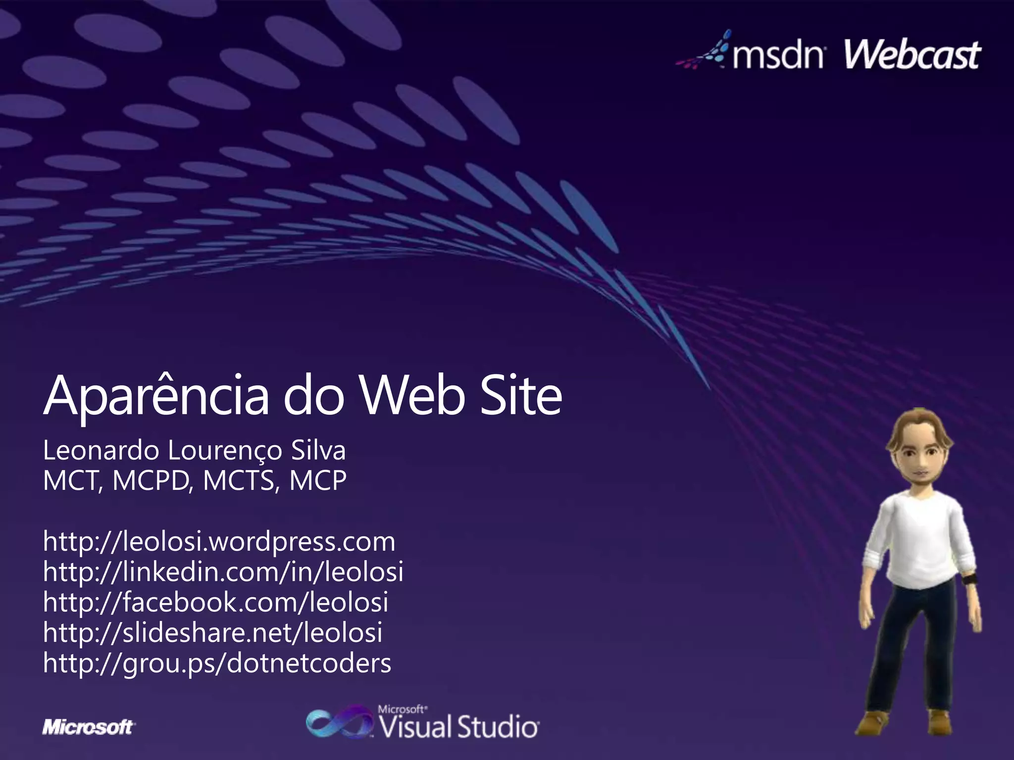 O documento discute páginas mestre e filhas em ASP.NET, permitindo herança visual entre páginas. Páginas filhas herdam o layout de páginas mestre através do atributo MasterPageFile. CSS, temas e skins podem ser usados para padronizar a aparência de páginas no site.