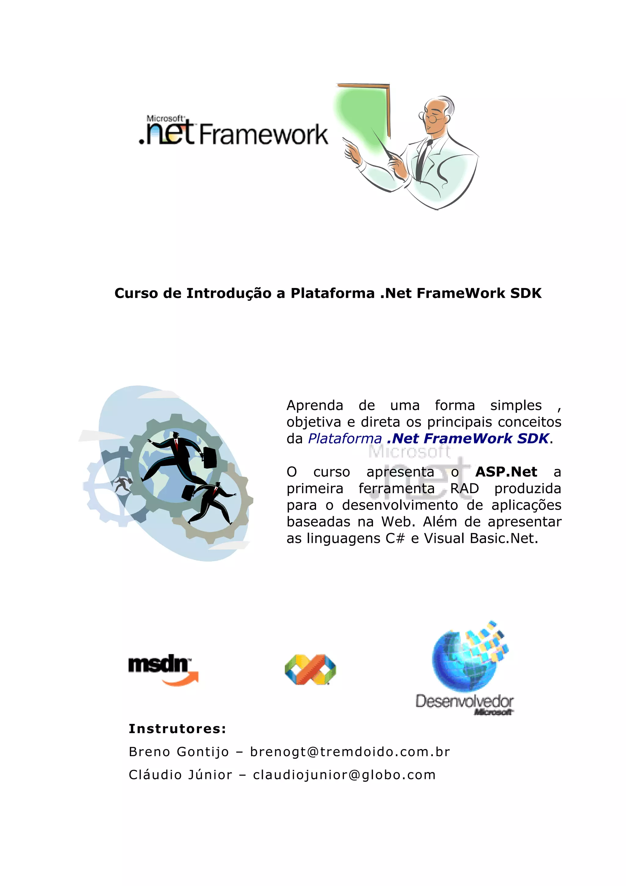 O documento apresenta um curso introdutório sobre a plataforma .NET Framework SDK, incluindo conceitos básicos, ASP.NET para desenvolvimento web, as linguagens C# e Visual Basic.NET, variáveis, estruturas de controle, formatação e componentes web como TextBox e Button. Os instrutores do curso são Breno Gontijo e Cláudio Júnior.