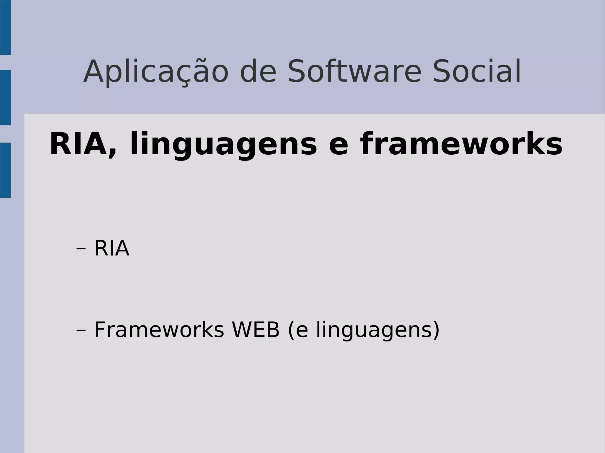O documento discute aplicações web sociais, frameworks e linguagens. Apresenta RIA (Aplicações Web Ricas) que oferecem funcionalidades avançadas sem necessidade de instalação, dividindo processamento entre cliente e servidor. Frameworks auxiliam o desenvolvimento web facilitando acesso a bancos de dados e templates. Linguagens como Python, PHP, Perl, Ruby e Java possuem frameworks populares como Django, Ruby on Rails e Struts.