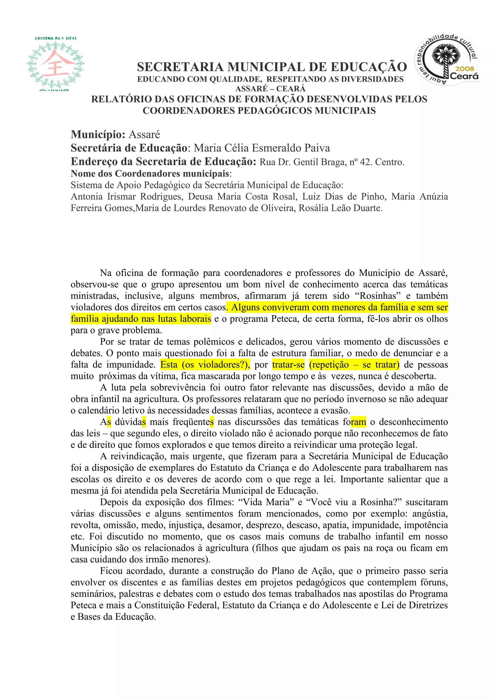 O documento relata sobre uma oficina de formação para coordenadores e professores do município de Assaré sobre direitos da criança e do adolescente. Os participantes discutiram temas como exploração infantil, violência doméstica e falta de estrutura familiar. Eles elaboraram um plano de ação para conscientizar estudantes e famílias sobre esses direitos através de projetos pedagógicos e parcerias com outras secretarias.