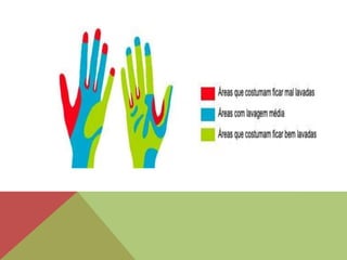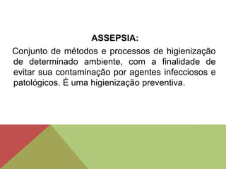 O documento discute conceitos e métodos relacionados à assepsia, infecção, desinfecção, antissepsia e esterilização. Ele também descreve os equipamentos de proteção individual usados para prevenir a transmissão de microrganismos, como luvas, máscaras, óculos e aventais. A lavagem correta das mãos é apresentada como a melhor forma de prevenir infecções cruzadas.