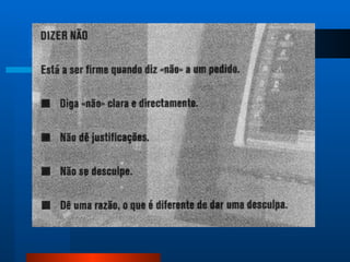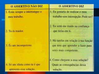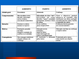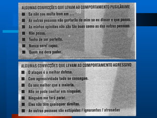 1) O documento discute a assertividade e os três tipos de comportamento - agressivo, passivo e assertivo.