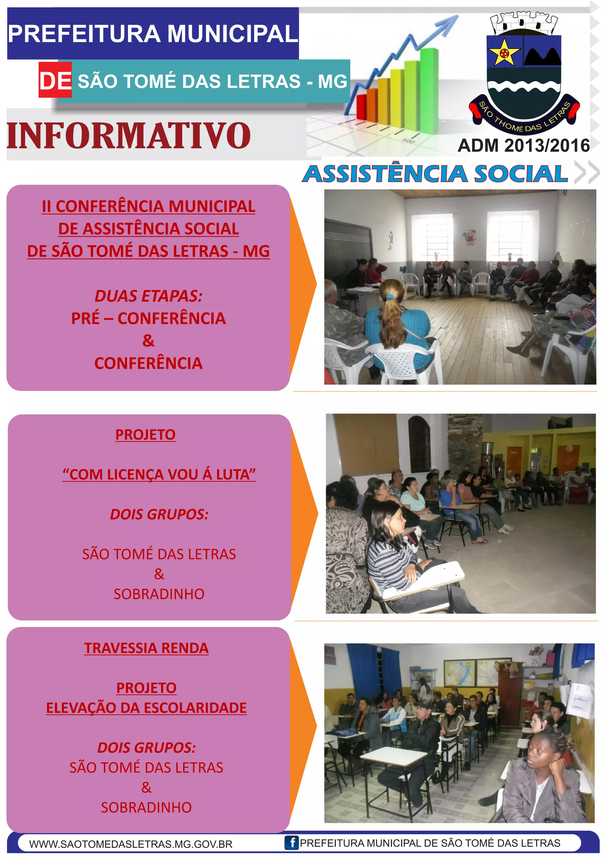A Prefeitura de São Tomé das Letras está organizando a II Conferência Municipal de Assistência Social, que terá duas etapas: pré-conferência e conferência. Dois projetos serão desenvolvidos com grupos de São Tomé das Letras e Sobradinho: "Com Licença Vou à Luta", que envolve a travessia renda, e "Elevação da Escolaridade".