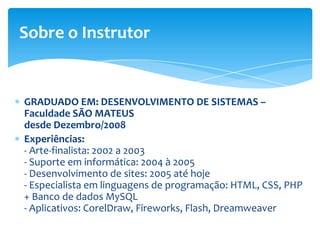 (1) O documento apresenta o perfil profissional de Daniel Brandão, instrutor de programação visual gráfica. Ele tem experiência em design, desenvolvimento de sites e programação.