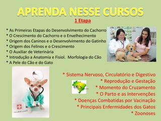O documento descreve cursos de capacitação para auxiliares de veterinários e banho e tosa de animais. Os cursos incluem aulas teóricas e práticas sobre anatomia, primeiros socorros, reprodução, vacinação e outros tópicos relevantes. Os alunos receberão certificados reconhecidos para trabalhar em clínicas veterinárias e pet shops.