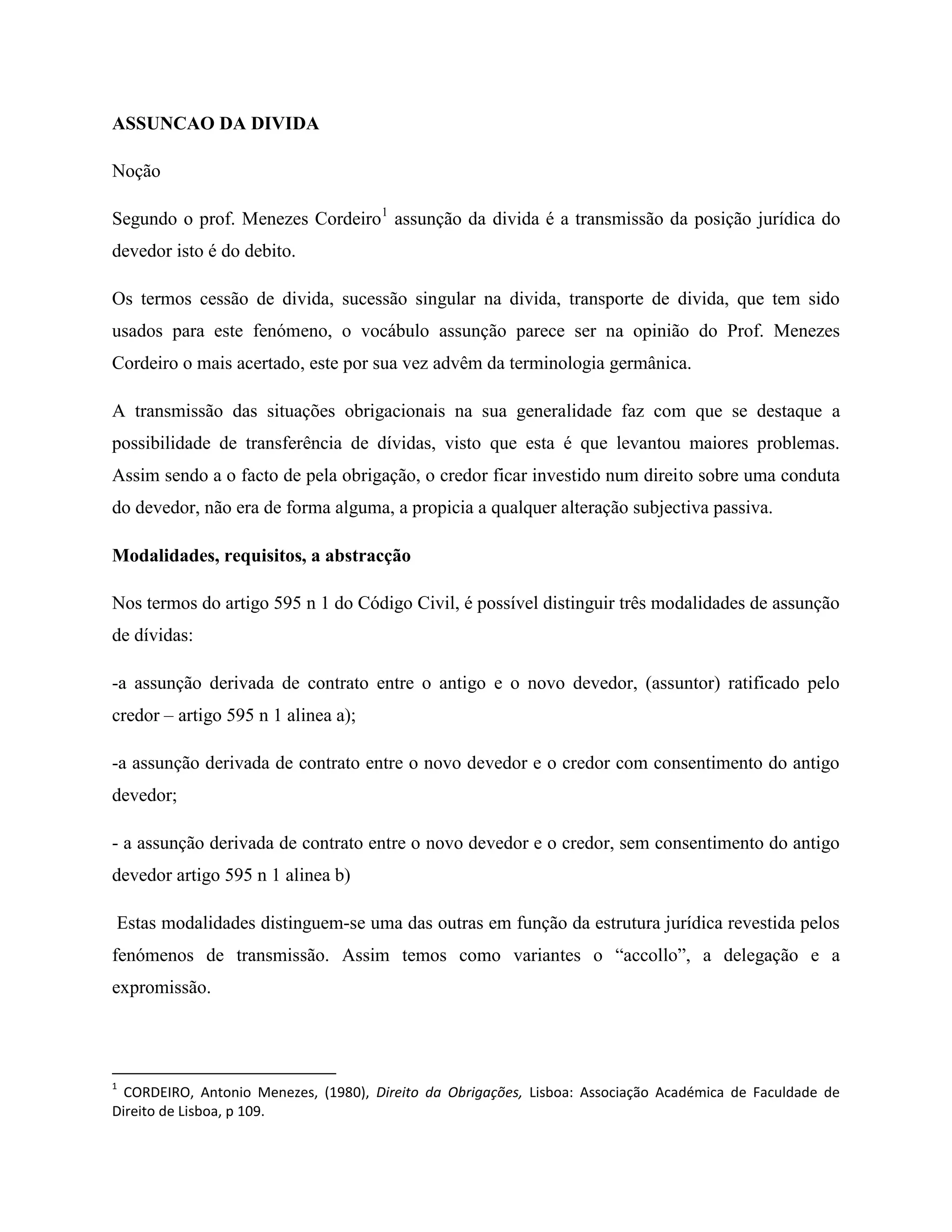 A assunção da dívida é a transmissão da posição jurídica do devedor para um novo devedor (assuntor), com o consentimento do credor, podendo ser liberatória ou cumulativa: (1) a assunção liberatória transfere a dívida e libera o devedor original, enquanto (2) a assunção cumulativa mantém o devedor original responsável solidariamente com o novo devedor.