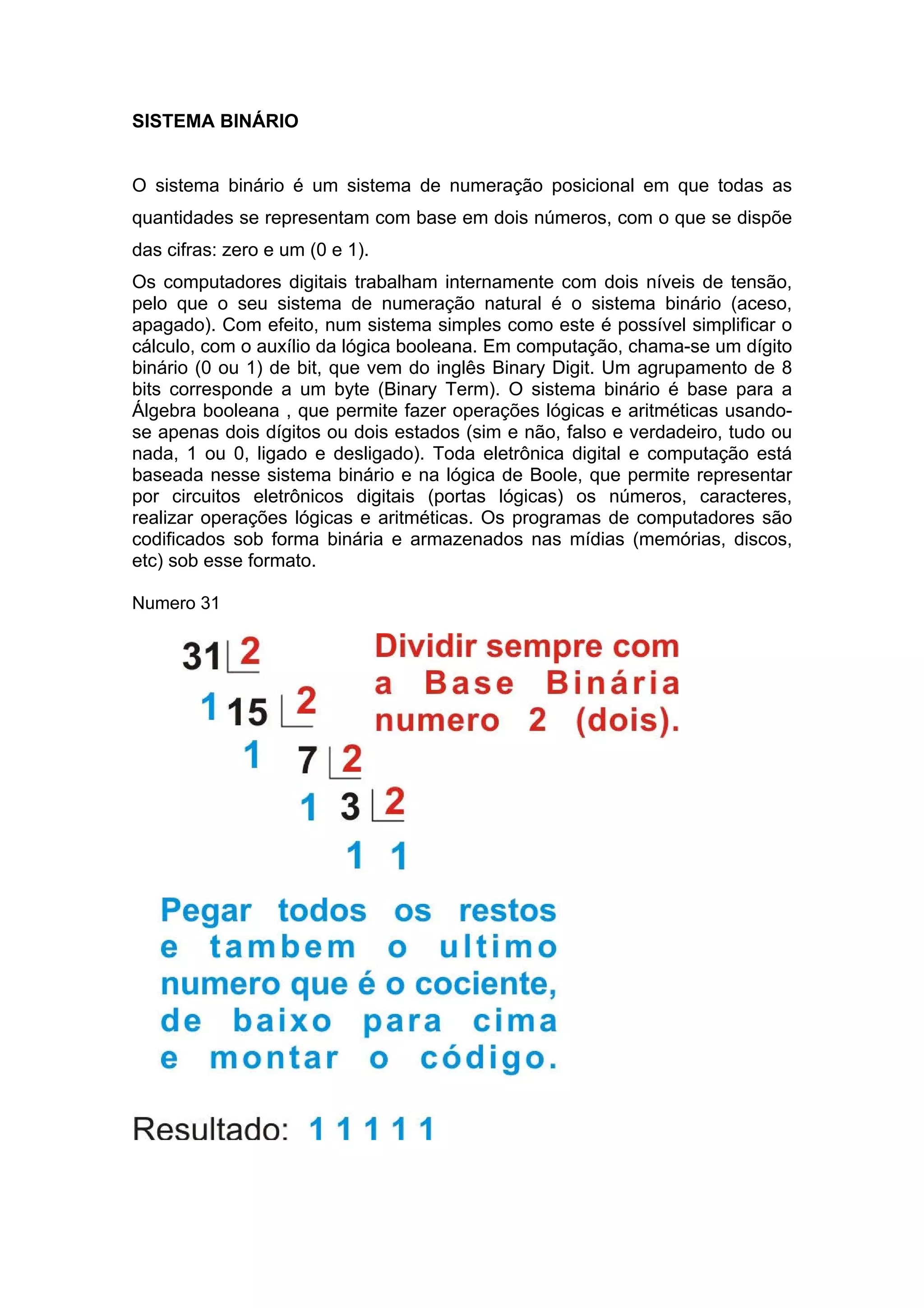 O sistema binário é um sistema de numeração posicional baseado em apenas dois dígitos, 0 e 1. É o sistema usado internamente pelos computadores digitais e é a base para a álgebra booleana e lógica digital. Toda a eletrônica digital e computação está baseada nesse sistema binário e na lógica de Boole.