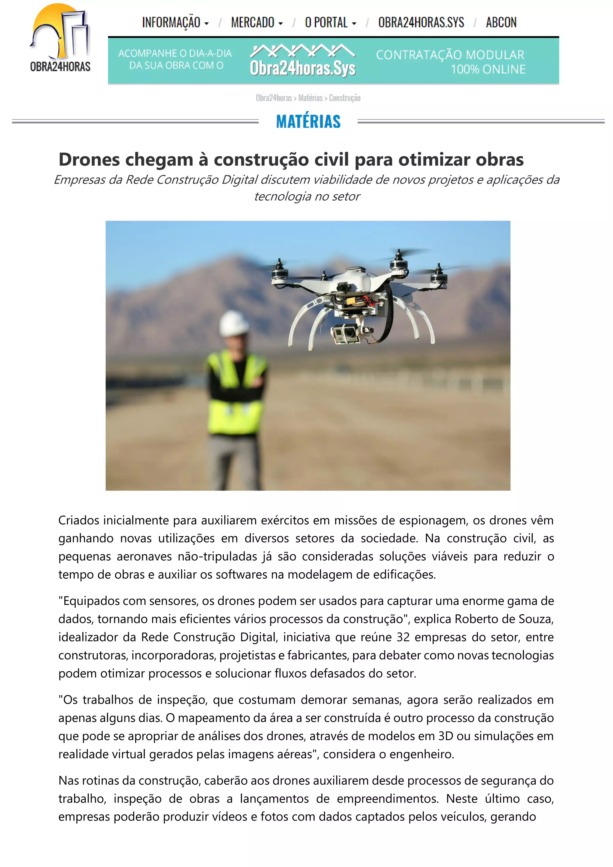 Drones estão sendo estudados para aplicações na construção civil, como mapeamento de áreas, inspeção de obras e geração de simulações para clientes. Uma rede de empresas do setor analisa projetos para integrar dados de drones e softwares de modelagem de obras.