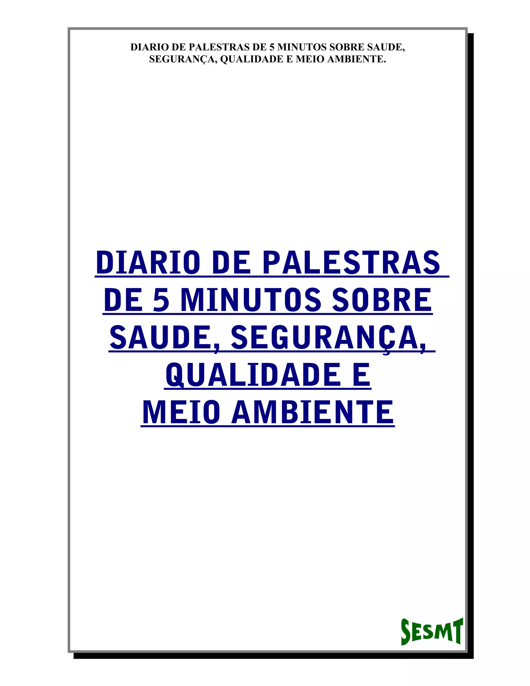 Este documento apresenta 134 palestras de 5 minutos sobre temas relacionados à saúde, segurança, qualidade e meio ambiente no ambiente de trabalho. As palestras abordam tópicos como poeira, equipamentos de proteção, ruído, iluminação, transporte de cargas, produtos químicos, primeiros socorros, eletricidade, máquinas e ferramentas, entre outros. O objetivo é conscientizar os trabalhadores sobre esses riscos e formas de prevenção através de conversas diárias antes do início do turno.