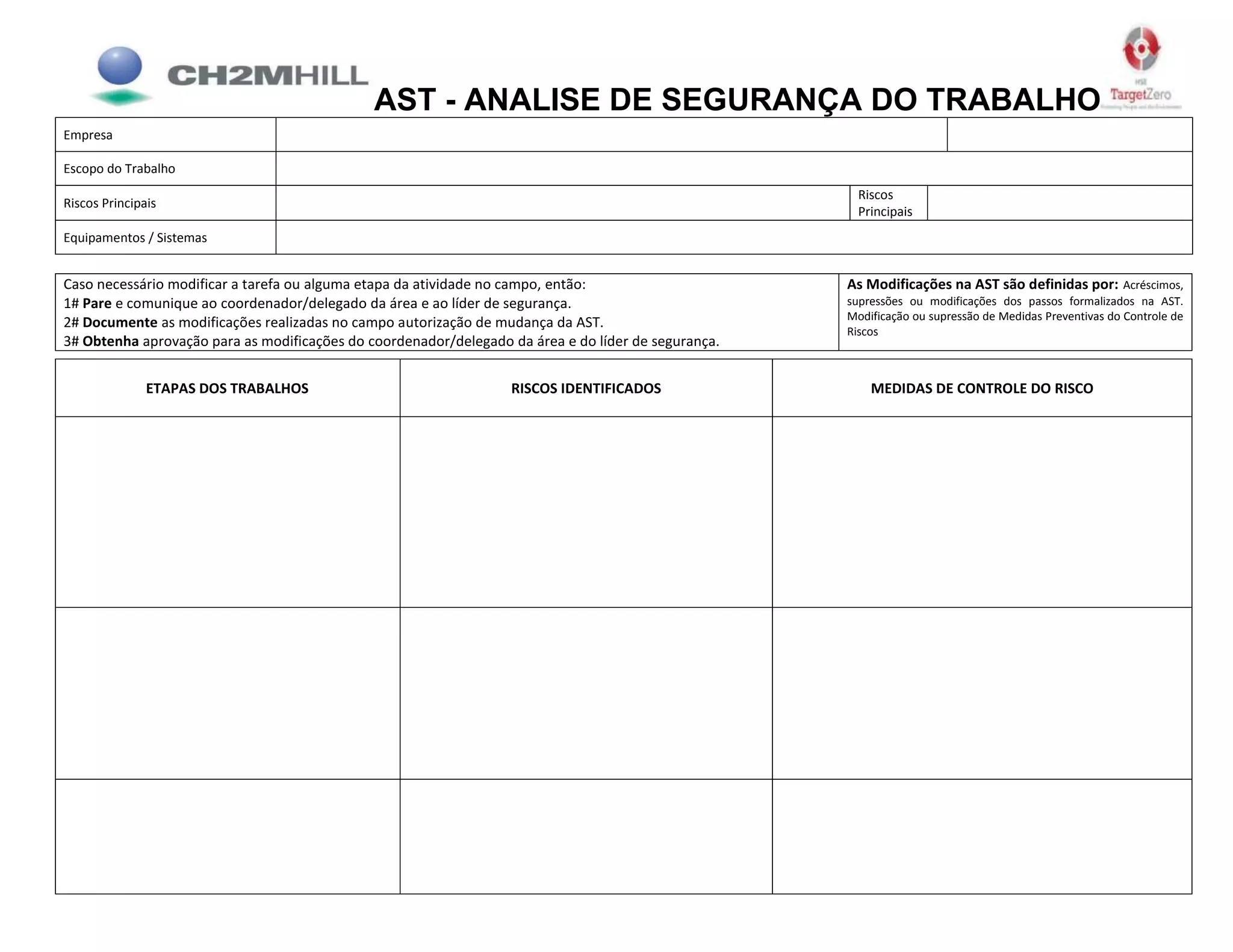 O documento é uma Análise de Segurança do Trabalho (AST) que descreve os riscos e medidas de controle associados a uma atividade. Ele lista os riscos principais, etapas dos trabalhos, riscos identificados e medidas de controle. Qualquer modificação na AST requer aprovação do coordenador e líder de segurança.