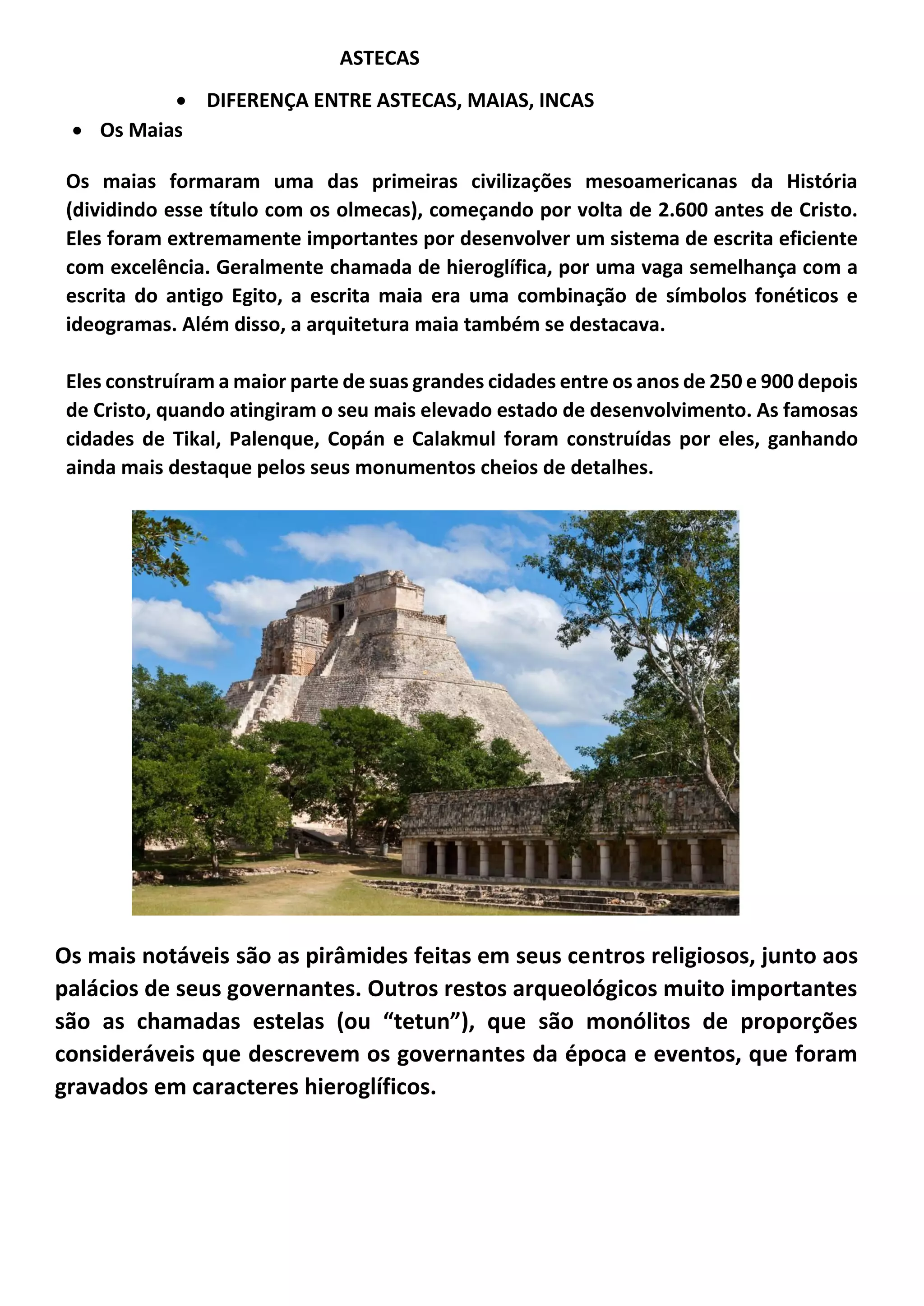 O documento aborda as civilizações mesoamericanas, incluindo maias, incas e astecas, destacando suas características, história e contribuições culturais. Os maias foram conhecidos por seu sistema de escrita e arquitetura, os incas por seu vasto império e religiosidade, e os astecas por sua cosmologia e desenvolvimento artístico. Cada civilização teve um papel importante na história das Américas, com práticas e legados que influenciaram a cultura atual.