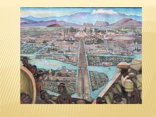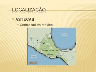 O documento descreve a sociedade asteca antes da chegada dos europeus. Os astecas construíram um grande império na América Central com uma capital avançada chamada Tenochtitlán e dominaram muitos povos vizinhos através da guerra e tributos. Eles tinham uma religião baseada no sacrifício humano e no deus da guerra Huitzilopochtli.