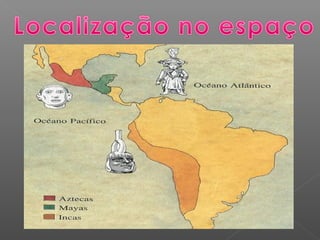 Este documento fornece um guia turístico sobre as civilizações dos Maias, Astecas e Incas, descrevendo suas origens, localizações, realizações culturais e sugestões de locais para visitar, incluindo cidades, pirâmides e templos construídos por essas civilizações na América Central e América do Sul.