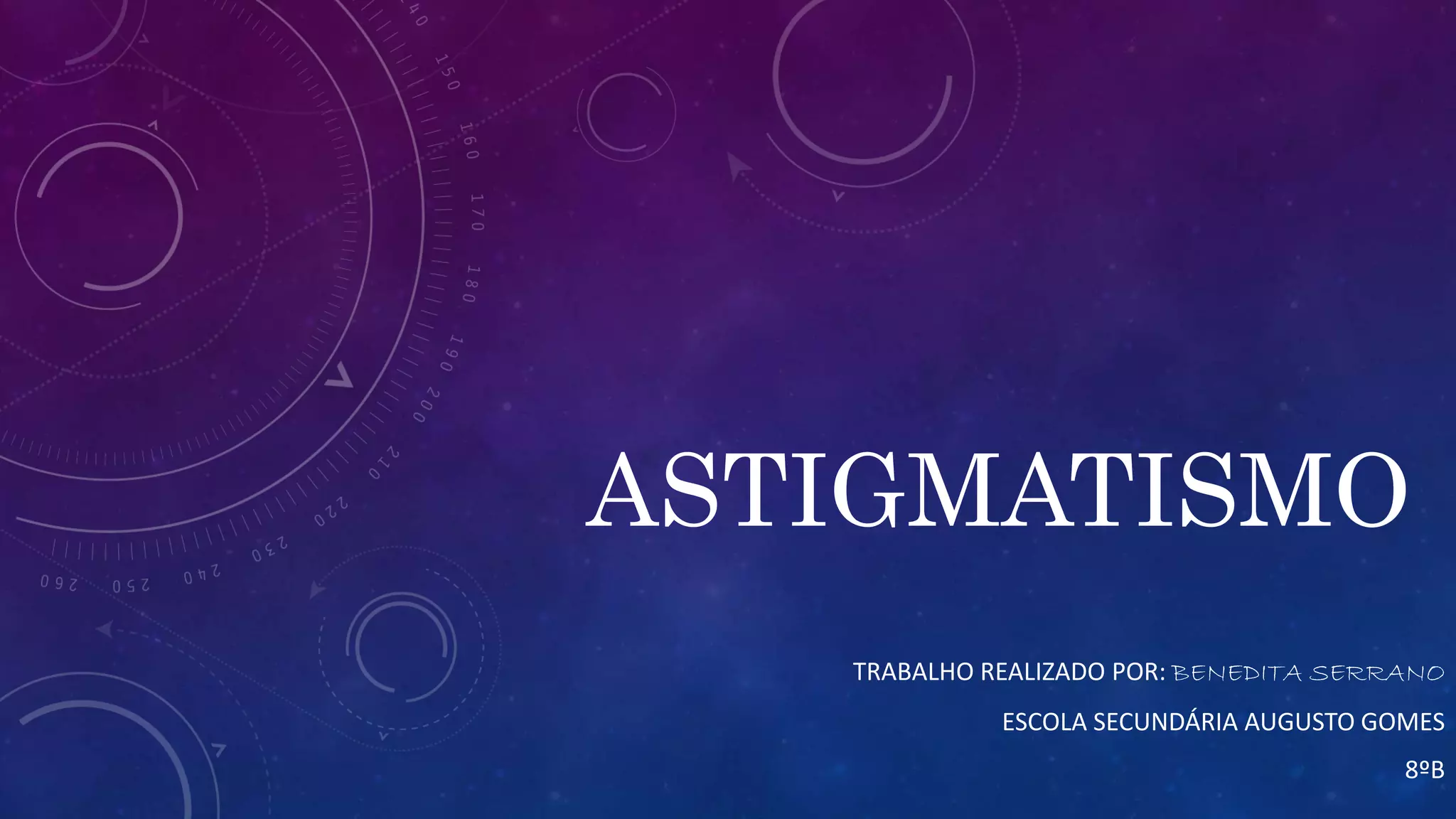 O astigmatismo é uma deficiência visual causada pela córnea ou cristalino terem uma forma irregular, fazendo com que a luz se refraia em vários focos. Pode causar visão desfocada e dores de cabeça. É corrigido com óculos, lentes de contato ou cirurgia, usando lentes convergentes para focar a luz em um único ponto na retina.