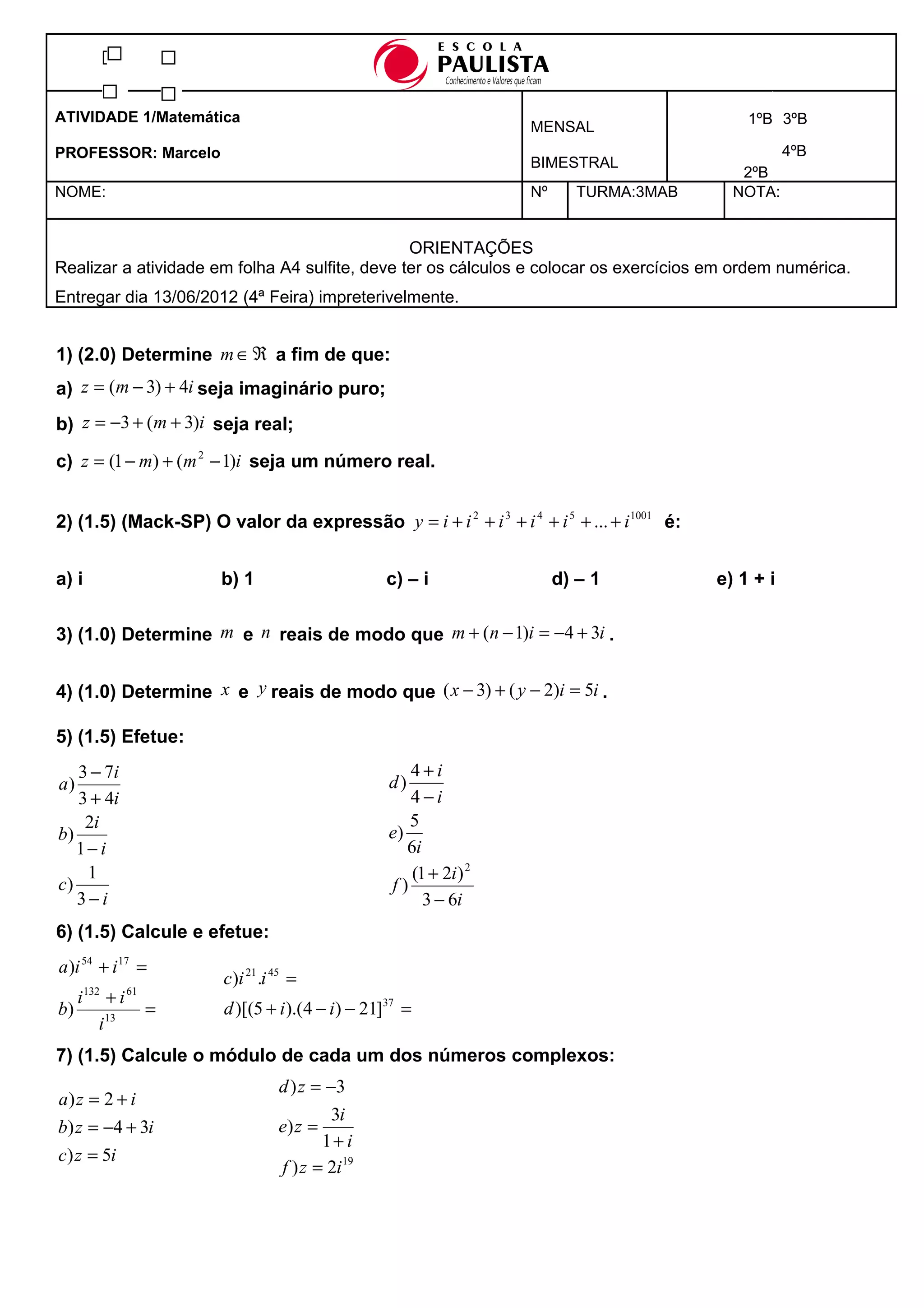 1) O documento é uma atividade de matemática com 7 questões sobre números complexos. Os alunos devem realizar os cálculos, ordenar os exercícios numericamente e entregar na quarta-feira, 13 de junho de 2012.