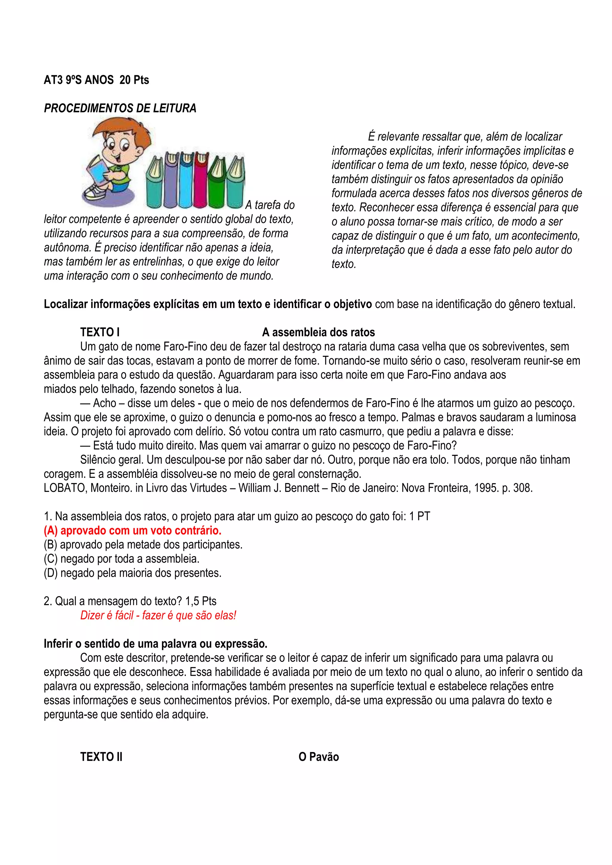 O documento discute procedimentos de leitura, enfatizando a importância de distinguir fatos de opiniões em textos e reconhecer informações explícitas e implícitas. Também discute a habilidade do leitor identificar o tema geral e objetivo de um texto.