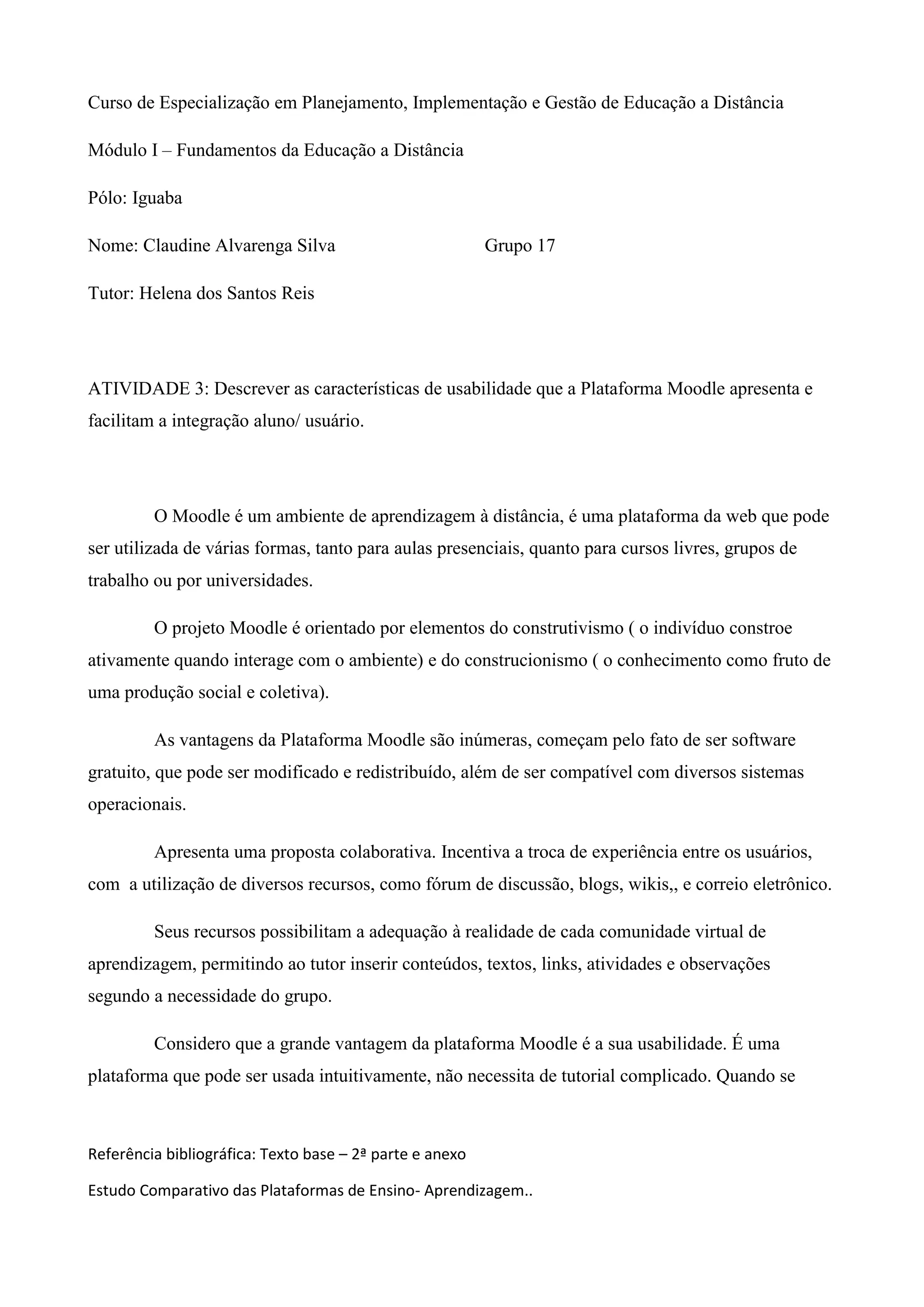 O documento descreve as características da plataforma Moodle que facilitam a integração aluno-usuário. A plataforma é gratuita, de código aberto, compatível com diversos sistemas e incentiva a colaboração por meio de recursos como fóruns, blogs e wikis. Sua usabilidade é destacada, pois é intuitiva e reúne em uma página os itens necessários para cada disciplina.