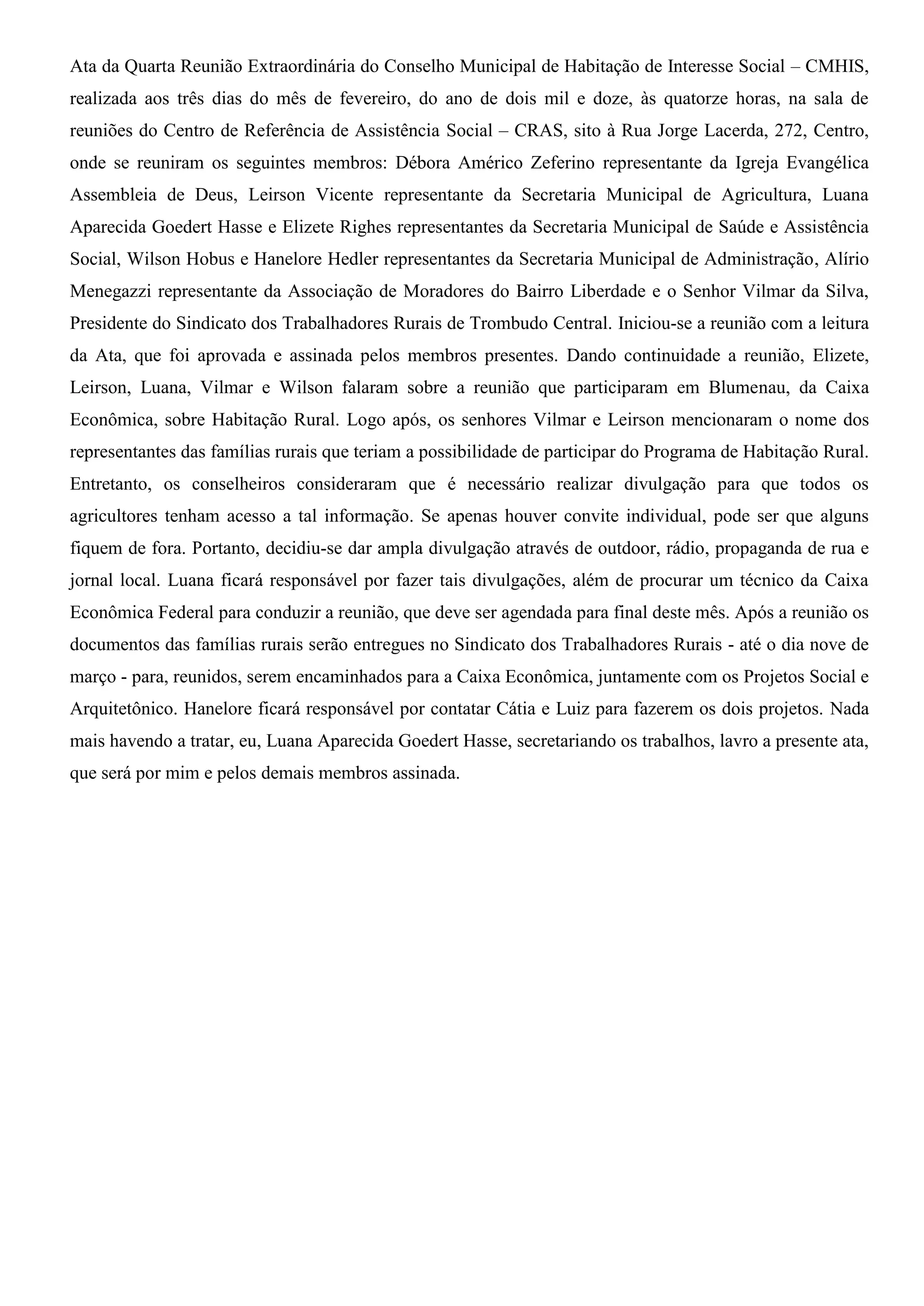 A reunião discutiu o Programa de Habitação Rural da Caixa Econômica, com Vilmar e Leirson mencionando famílias elegíveis. Porém, os conselheiros decidiram dar ampla divulgação do programa através de outdoors, rádio e jornal para garantir que todos os agricultores sejam informados. Luana ficará responsável pela divulgação e agendamento de uma reunião com um técnico da Caixa ainda neste mês.