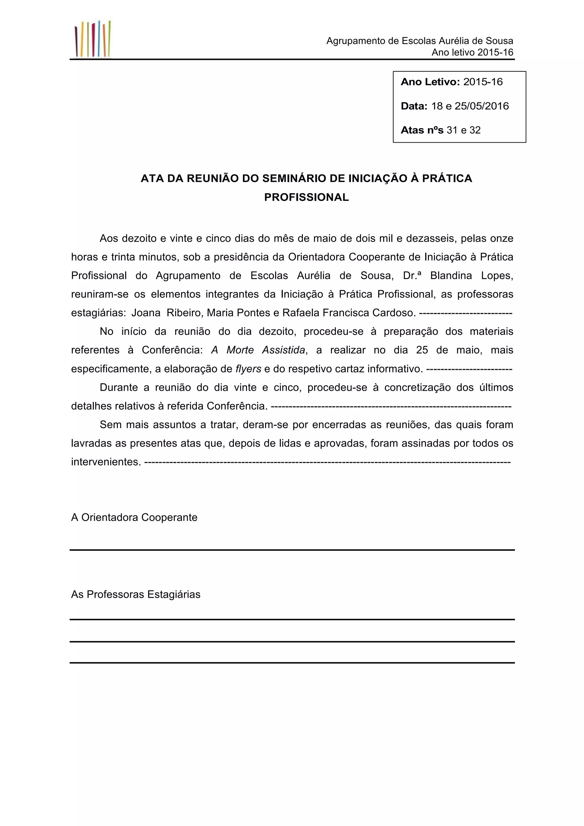 Este documento descreve as atas de duas reuniões do seminário de iniciação à prática profissional no Agrupamento de Escolas Aurélia de Sousa. Na primeira reunião, os estagiários prepararam materiais como flyers e cartazes para uma conferência sobre morte assistida. Na segunda reunião, finalizaram os detalhes da conferência. As atas foram lidas, aprovadas e assinadas no final.