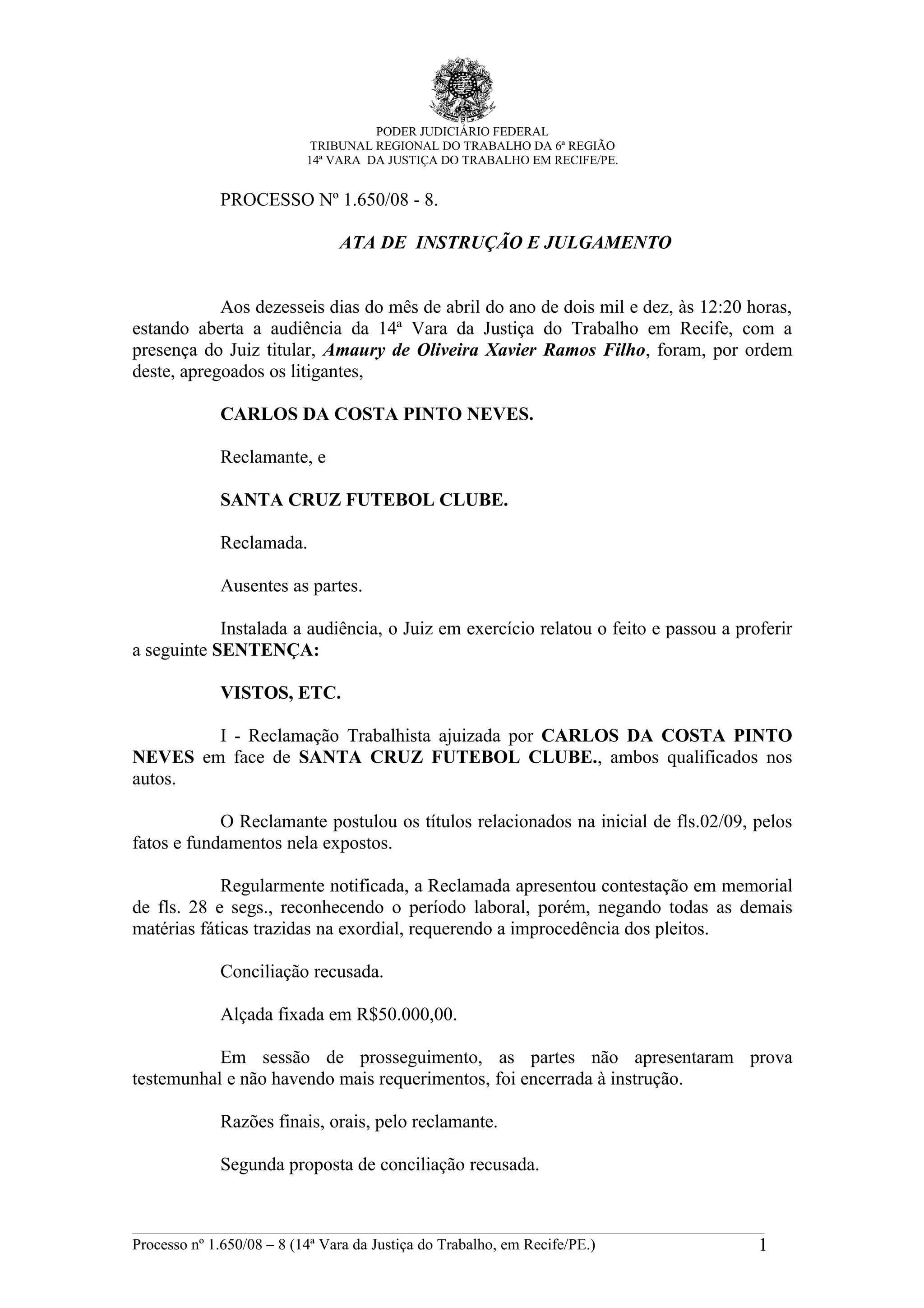 Este documento apresenta a sentença de um processo trabalhista entre Carlos da Costa Pinto Neves e o Santa Cruz Futebol Clube. A sentença reconhece o período trabalhado pelo reclamante, sua remuneração mensal de R$6.000,00, sua dispensa imotivada e condena o reclamado a pagar as verbas rescisórias devidas como aviso prévio, férias, 13o salário e horas extras trabalhadas.