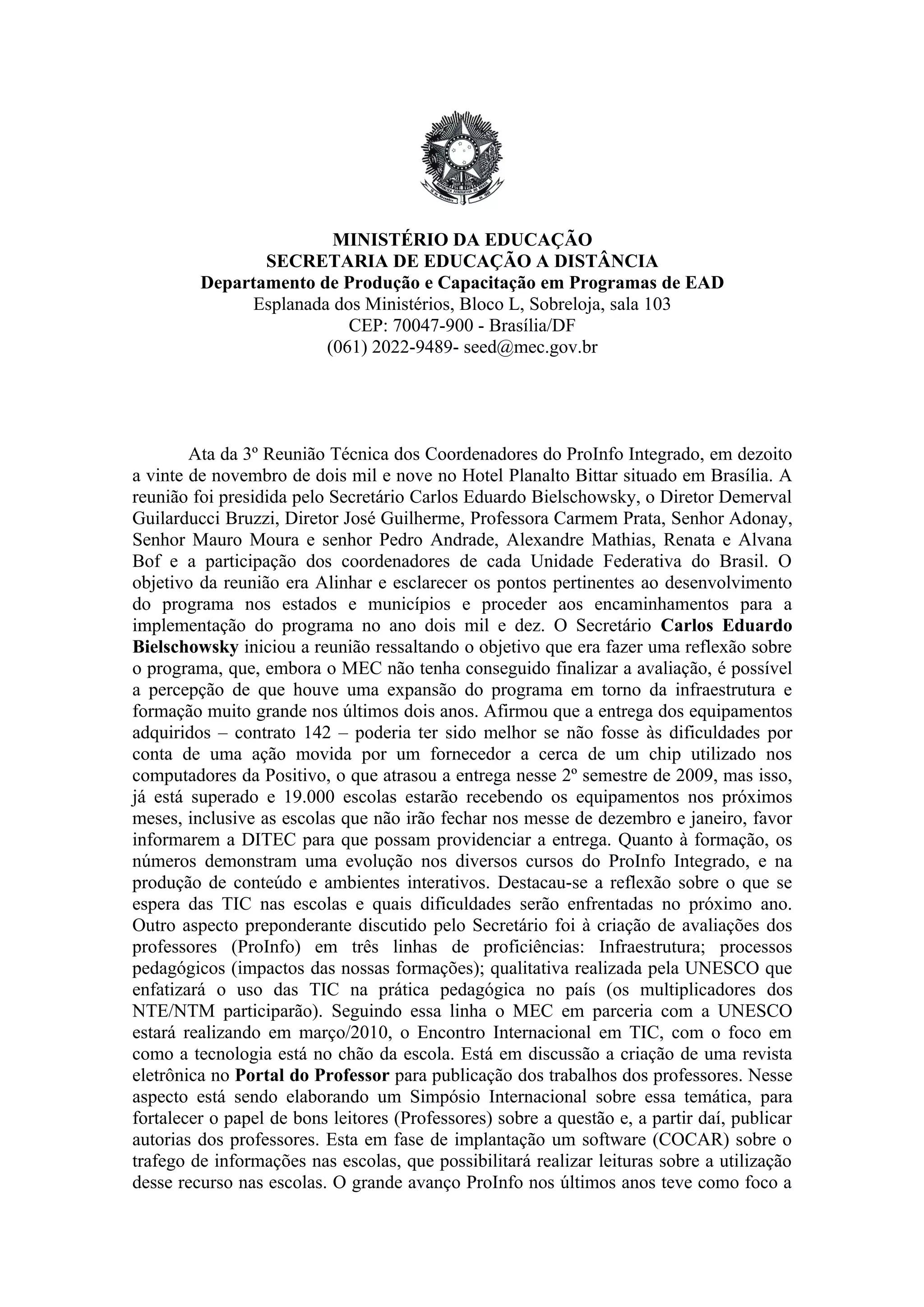 A ata resume a 3a Reunião Técnica dos Coordenadores do ProInfo Integrado em 2009. Os principais pontos discutidos foram: 1) o avanço do programa nos últimos anos e os desafios para 2010, 2) a proposta de avaliação dos professores e escolas sobre o uso das TIC, e 3) os detalhes da implementação do programa em 2010, incluindo a entrega de equipamentos e a expansão para novas escolas.